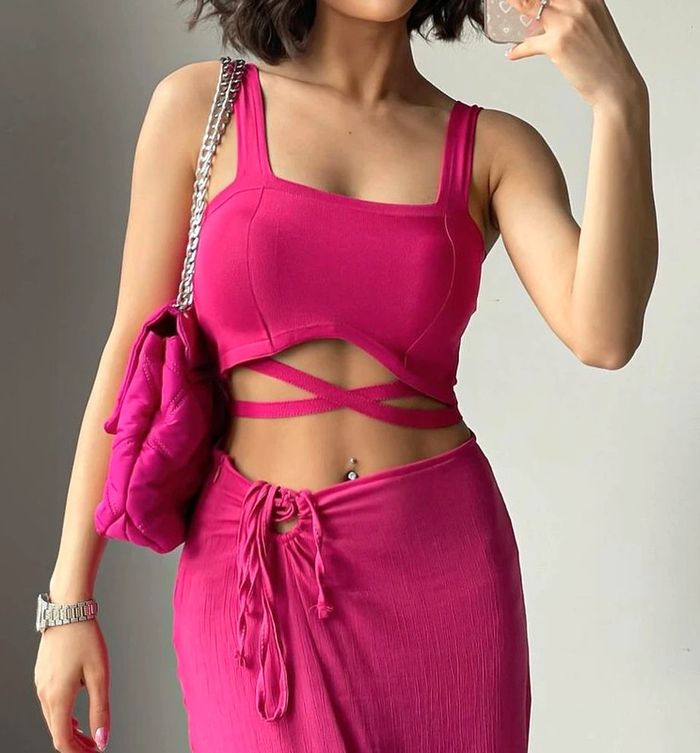 Jolie bustier/ crop top d'été, collection actuelle, en maille gaufré, matière extensible et confortable, à large bretelles, décolleté carré, avec lien nouer à la taille couleur: rose très tendance et sexy, taille 38, noté 40 mais taille un peu petit neuf