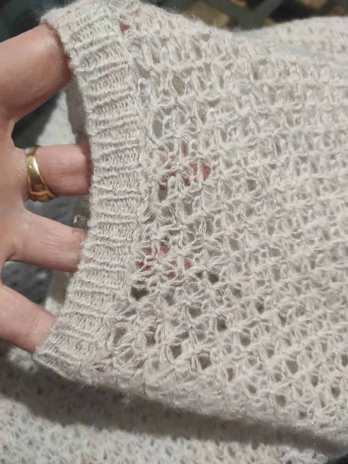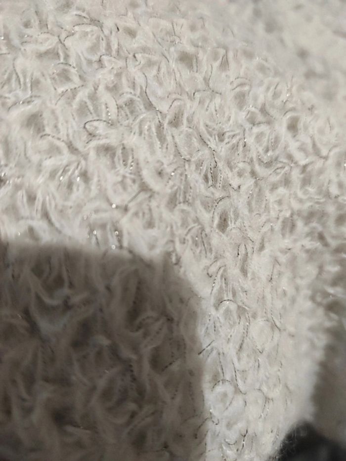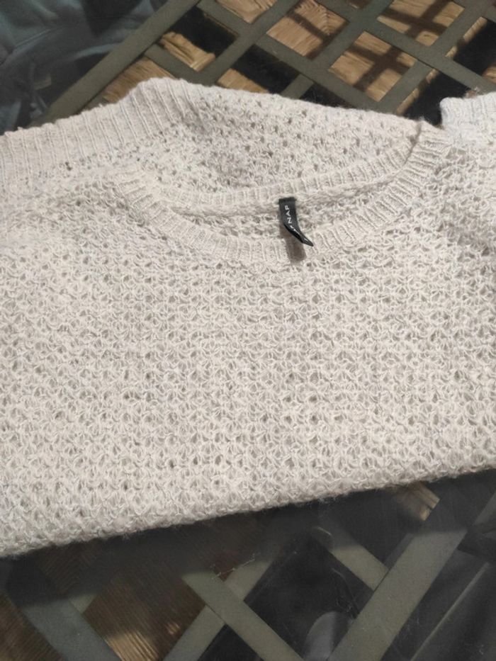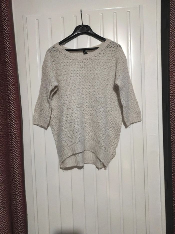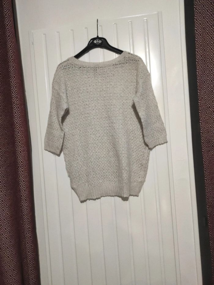 Pull fin femme XS Naf Naf,avec manche au niveau du coude , blanc cassé avec des filaments pailleté