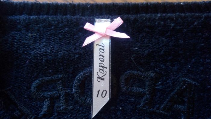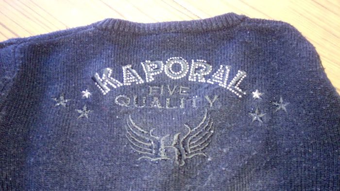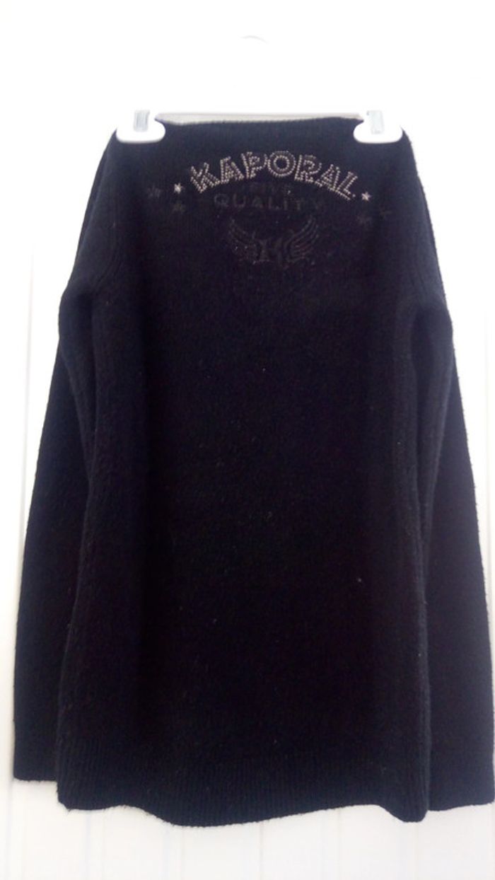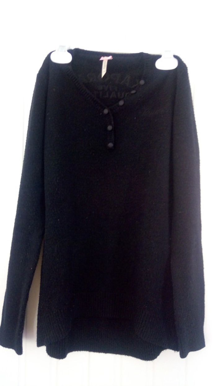 Pull noir fin assez long,environ sous les fesses avec col en V et des boutons et à l'arrière noté la marque avec des strass .en bon état mais manque quelque strass.