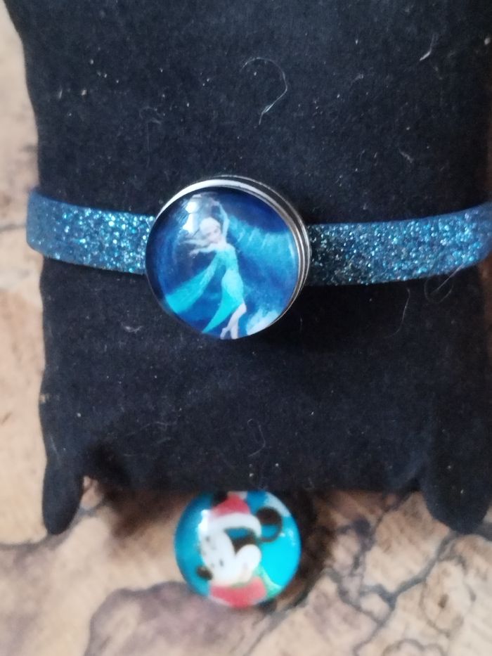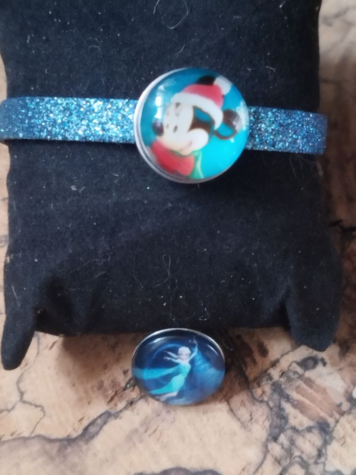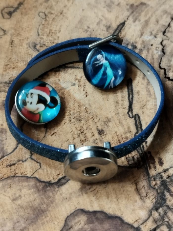 Bracelet bleu pailleté avec ses 2 boutons interchangeables Mickey et Reine des Neiges jamais porté