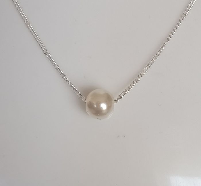 Chaine coloris argenté avec petite perle blanche. Longueur : 40 cms. Neuf sous blister. N'hésitez pas à regarder mes autres ventes. Envoi rapide et soigné.