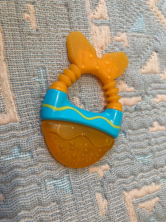 hochet de dentition avec effet réfrigérant à placer au frigo, le liquide à l’intérieur, conçu pour, maintien un effet frais sur les gencives de bébé. acheté neuf ma fille n’a jamais voulu l’utiliser
