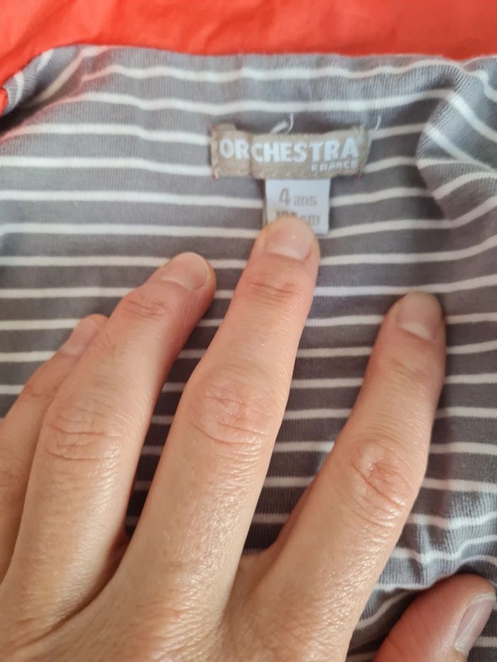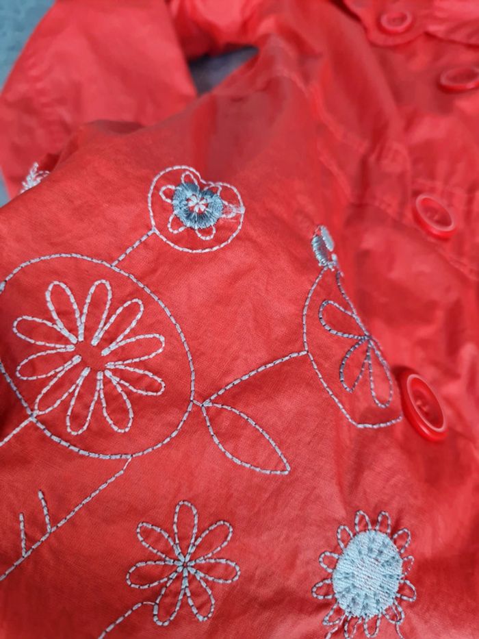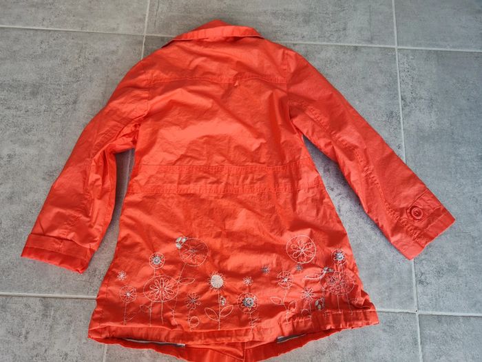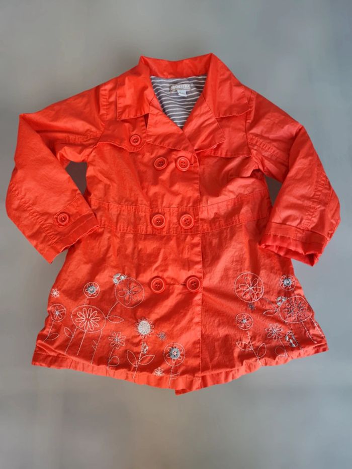 ⚠️⚠️pas d'envoi via Vinted Go svp⚠️⚠️ Orchestra 4 ans. Jolie veste fille type trench, tissu enduit, rouge corail avec fleurs brodées. Assez léger, à boutons. Comme neuf (a été porté une fois, 2 petits points noir sur une couture d'une manche->photo. Je le précise mais très discret). Articles lavés avant la vente, maison non fumeur
