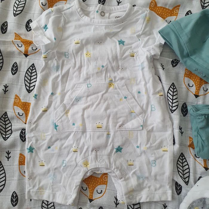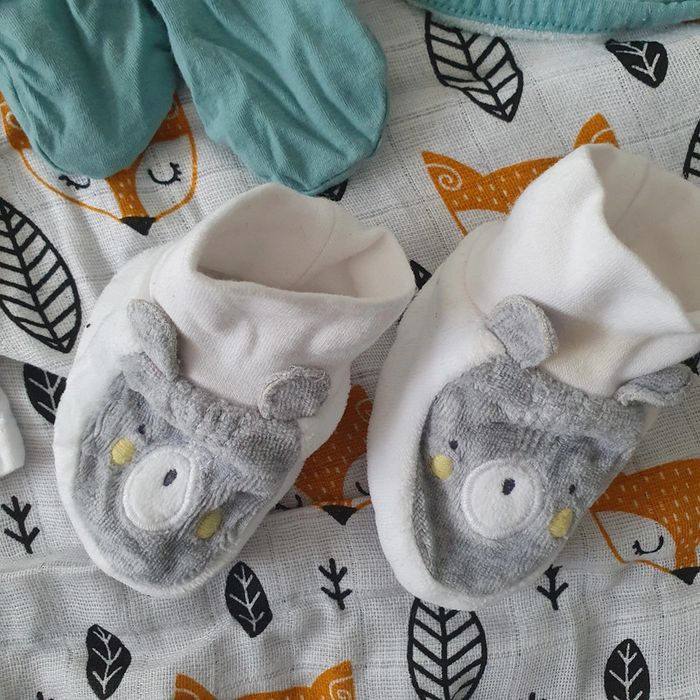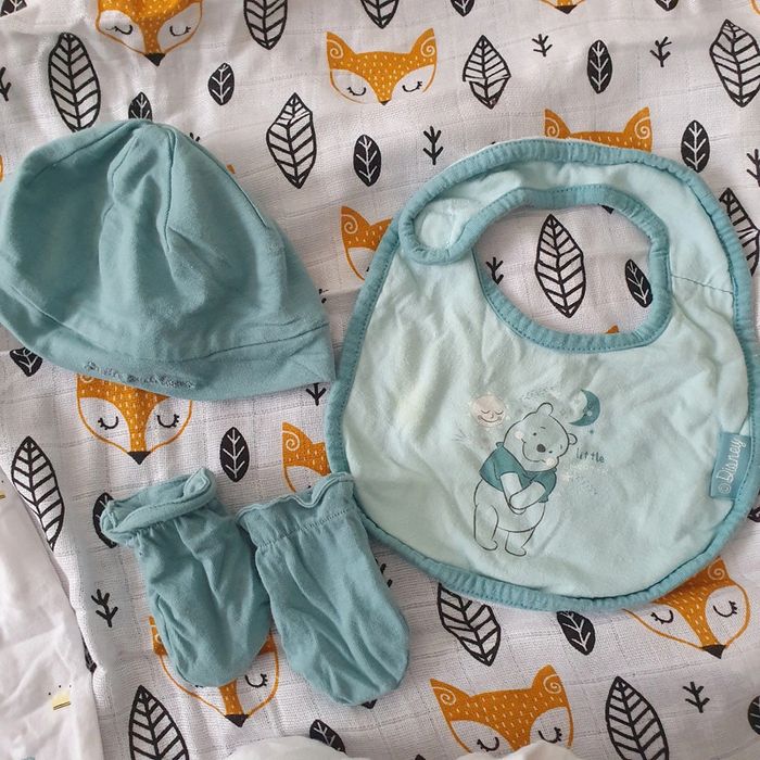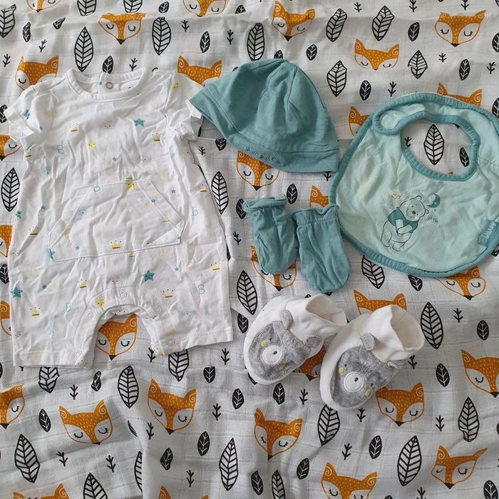 1 combishort, 1 bonnet, des moufles, un bavoir et des chaussons #lot #naissance #54cm #orchestra #ledressingdenouna_textile
