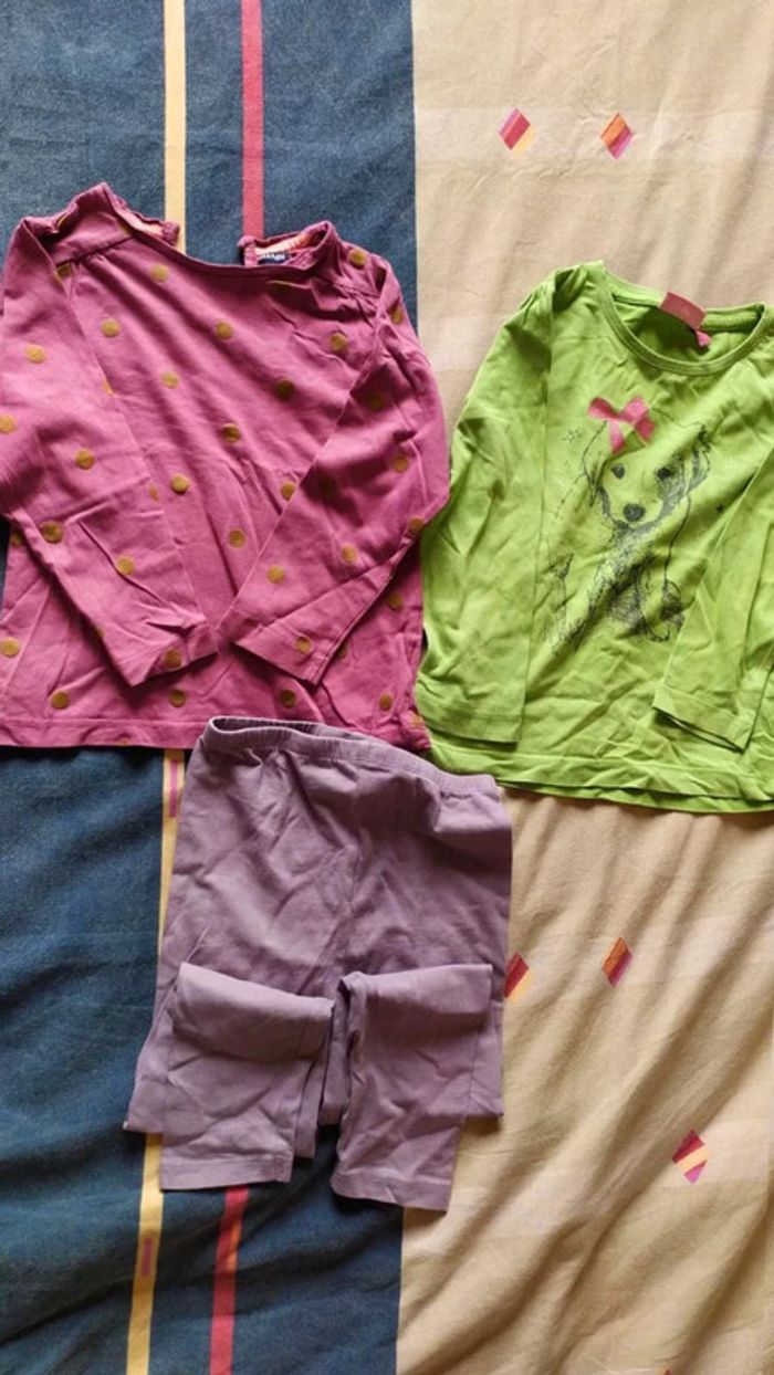 #24moisbebefilleceliapinho #36moisbebefilleceliapinho 🐨 Lot 3 pièces, articles portés, mais encore en très bon état 🐨 1 Haut rose avec des petits points dorés, en très bon état, 24 - 36 mois, #kiabi 🐨 1 Sweat vert, en très bon état, 24 -36 mois, #nky 🐨 1 legging violet foncé, en très bon état, 24 - 36 mois, #laredoute