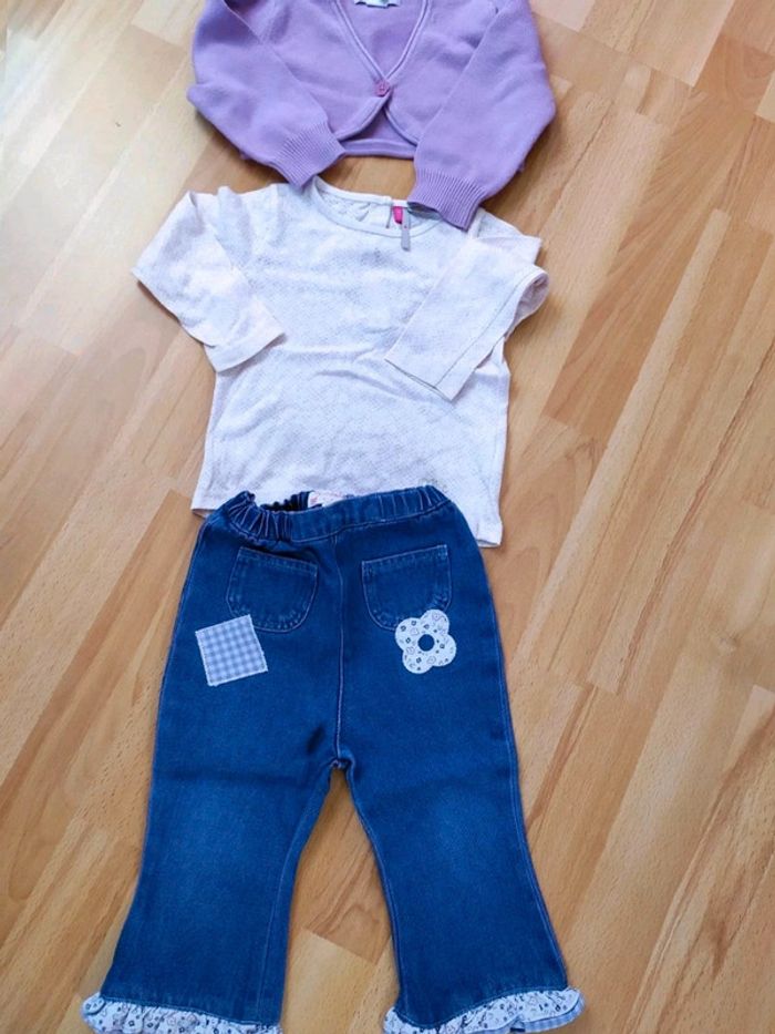 #12moisbebefilleceliapinho #18moisbebefilleceliapinho Lot 3 pièces 🖊 1 pantalon jeans en violet, 18 mois #kimbaloo 🖊 1 t-shirt manches longues rose pâle, 18 mois #orchestra 🖊 1 gilet rose, 18 - 24 mois, #gap 🖊 en très bon état