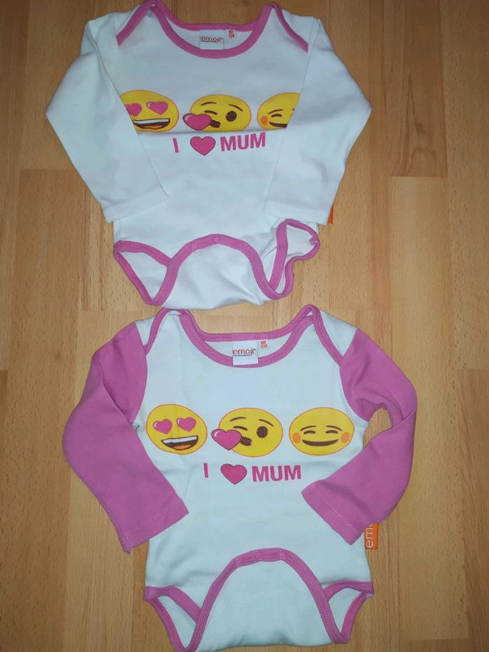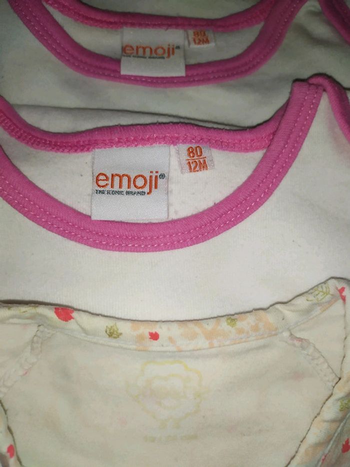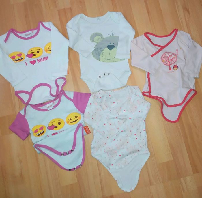 #9moisbebefilleceliapinho #12moisbebefilleceliapinho Lot 5 bodies 💫 portés mais en bon état général 💫 les bodies emojis : petits trous (voir photo 5) 💫 manches longues 💫 9 à 12 mois
