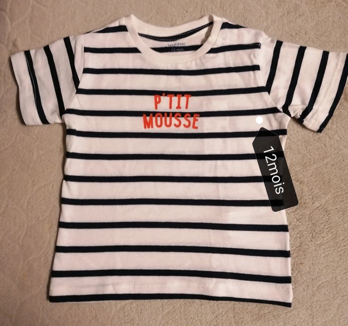 T. Shirts Manche courte Couleur marin :bleu /blanc Taille 12mois ( 74cm) Matière tissus 100 %coton 2 bouton clipses niveau épaule Neuf avec étiquette 4€