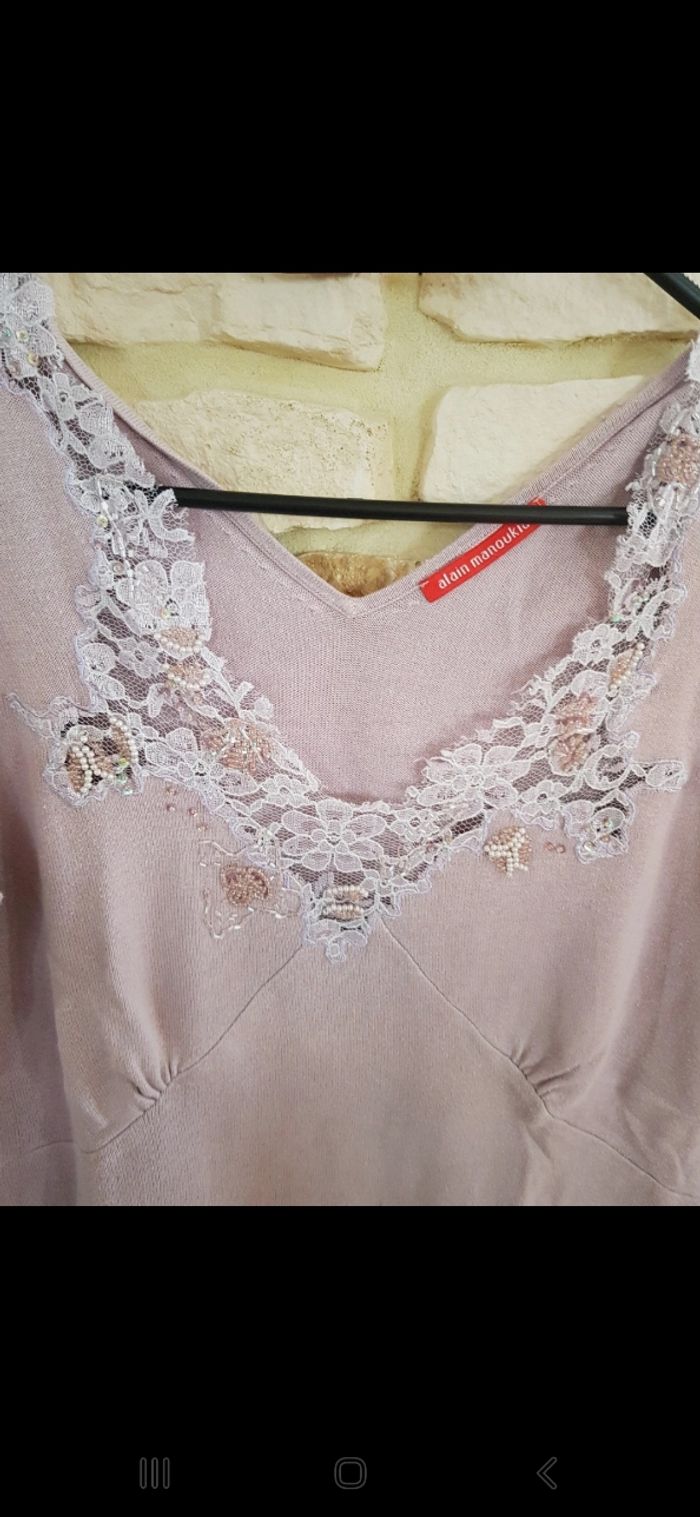 Pull très léger, col en V avec dentelle et perles, ainsi qu en bas des manches. Possibilité de le nouer dans le dos. Un peu bouloché