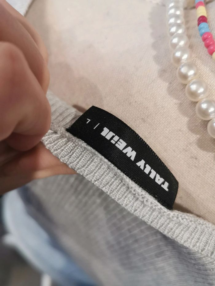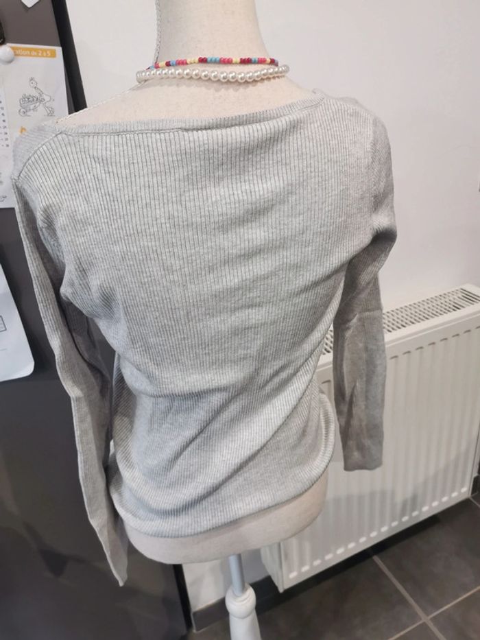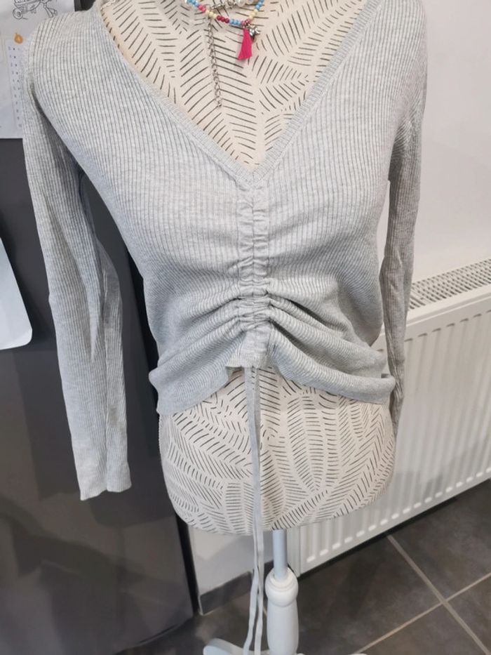 Petit pull gris clair col V manches longues Possible de remonter les cordon pour montrer le ventre Taille L (38/40) Comme neuf