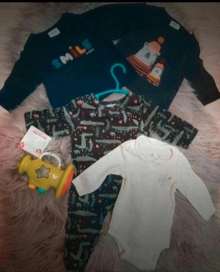 Lot 3mois pour garçon bodie ouverture devant a col, 2 haut manche longue le tout de marque tape à l'œil tao Jouet sonore premier âge neuf encore étiqueté #bébé #bebegarcon #vêtements #jonathandru3mois vendu sans le pyjama