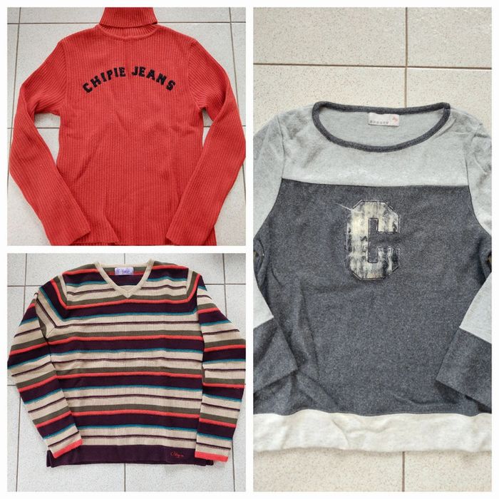 📖 Lot de 3 pulls Chipie. Pull rouge : col roulé, très bon état. Écrit XL, mais taille L. Pull rayé : col V, très bon état. Taille L Pull gris : jamais porté, neuf sans étiquette. Tissu doux. 🏷 Chipie 📏 Taille L 🛍 D'autres articles dans mon dressing avec #femmeaurelilou34 📉💰 Réductions activées sur les lots