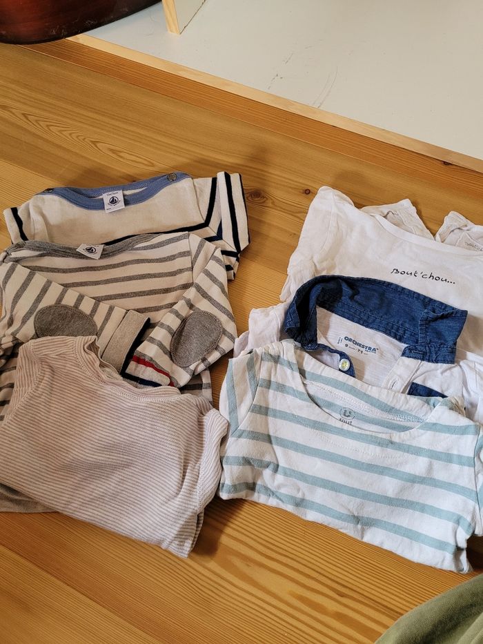 2 petit t shorts manches longues (epais) de la marque Petit Bateaux en 12 mois 1 t-shirt ML bout chou 18 mois 1 thirt ML orchestra 9 mois ( taille grand) 1 t-shirt ML super U 9 mois