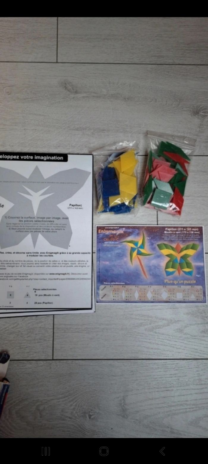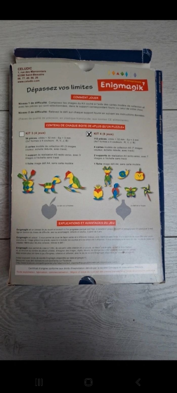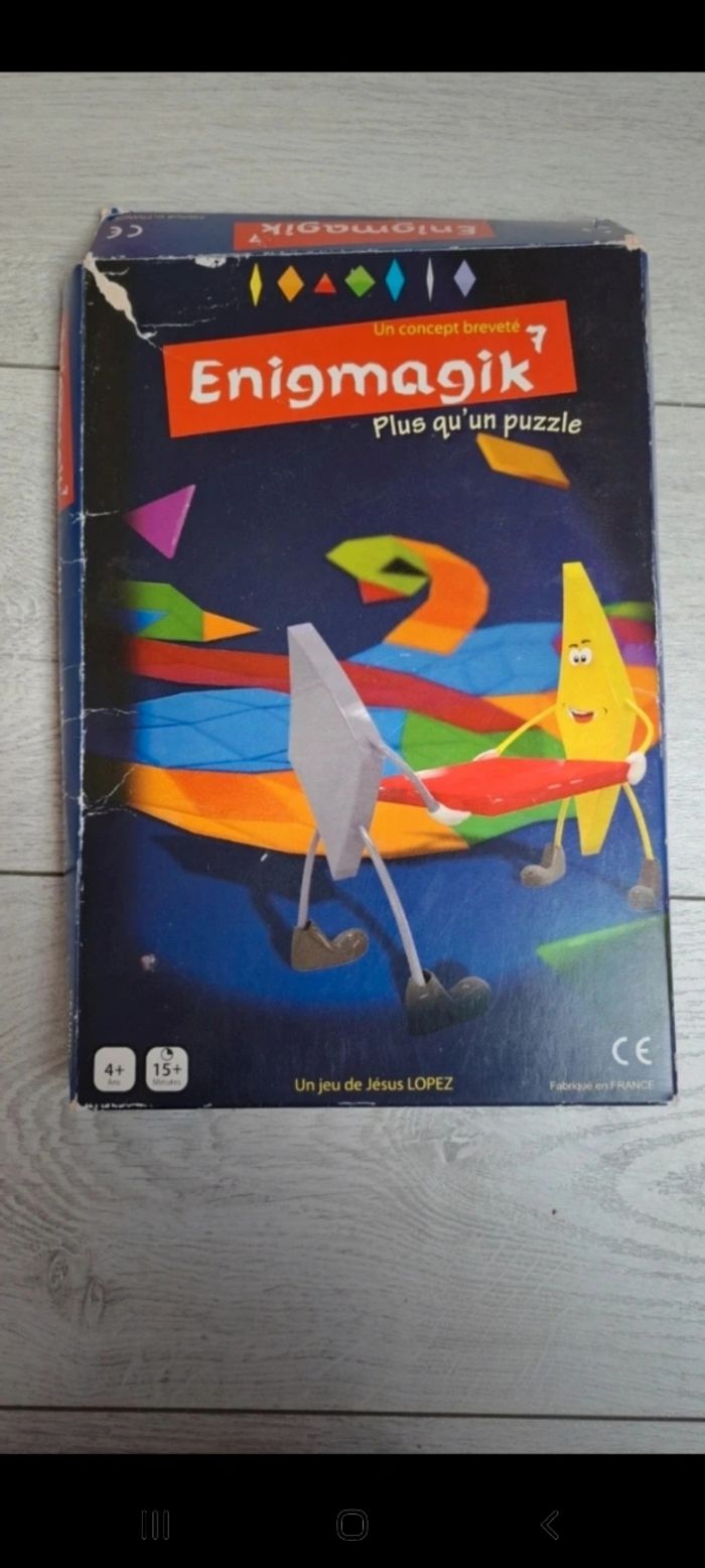 Jeu Enigmagik Jeu à partir de 4 ans jusqu'à pas d'âge. Jeu évolutif qui permet de progresser quelque soit l'âge avec différents niveaux de difficulté. 4 cartes modèle A5 et 2 supports A3 recto verso, également 1 fiche défi A4. Soit 8 jeux. C'est plus qu'un puzzle ou un tangram. Développe l'imaginaire et la créativité. Kit acheté 46€ avec les frais de En excellent état sauf la boîte abîmée.