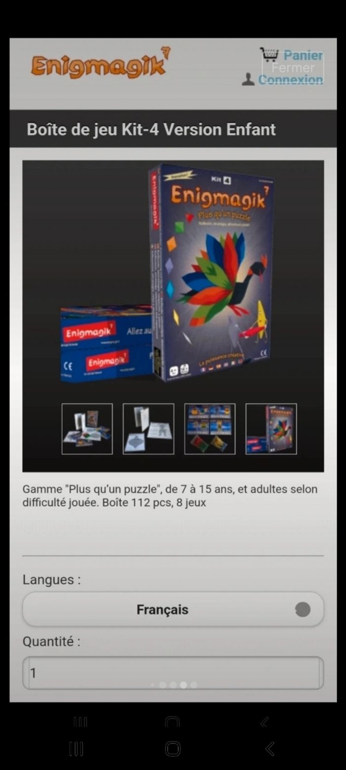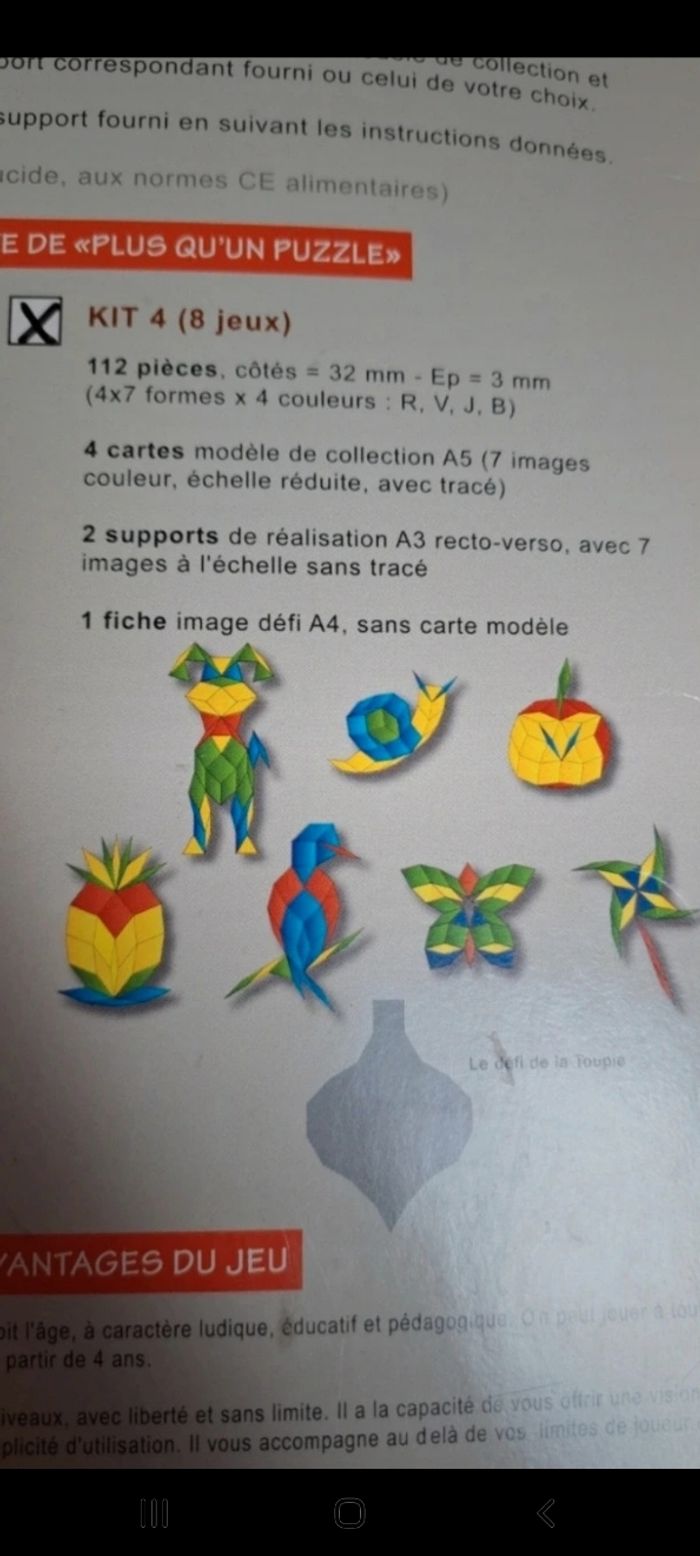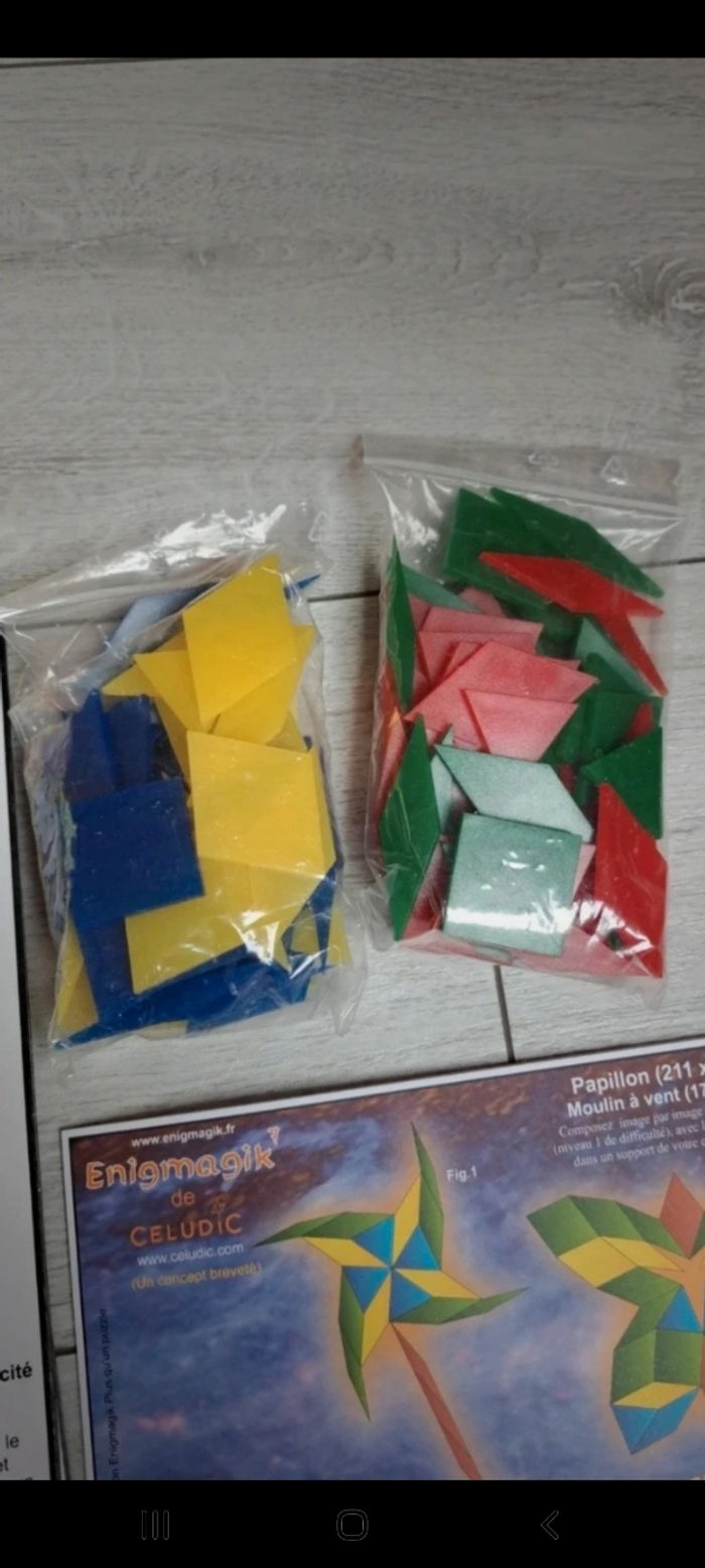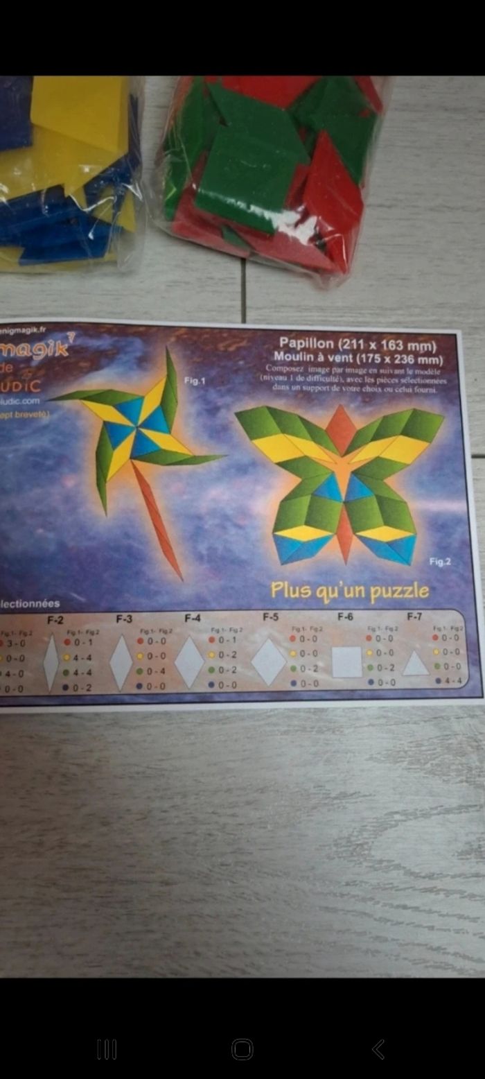 Jeu Enigmagik Jeu à partir de 4 ans jusqu'à pas d'âge. Jeu évolutif qui permet de progresser quelque soit l'âge avec différents niveaux de difficulté. 4 cartes modèle A5 et 2 supports A3 recto verso, également 1 fiche défi A4. Soit 8 jeux. C'est plus qu'un puzzle ou un tangram. Développe l'imaginaire et la créativité. Kit acheté 46€ avec les frais de En excellent état sauf la boîte abîmée.