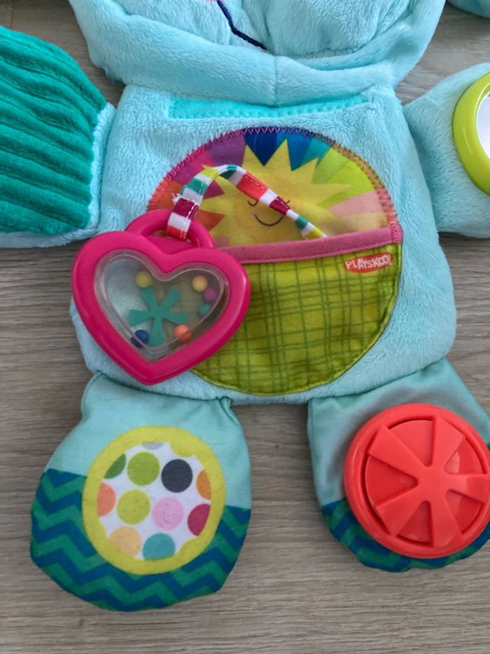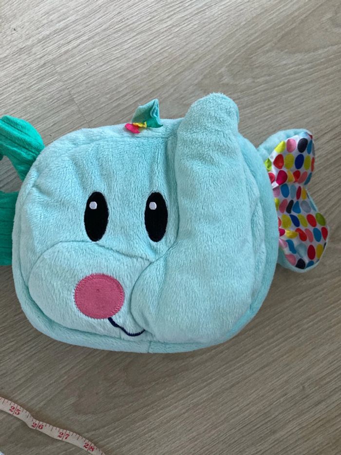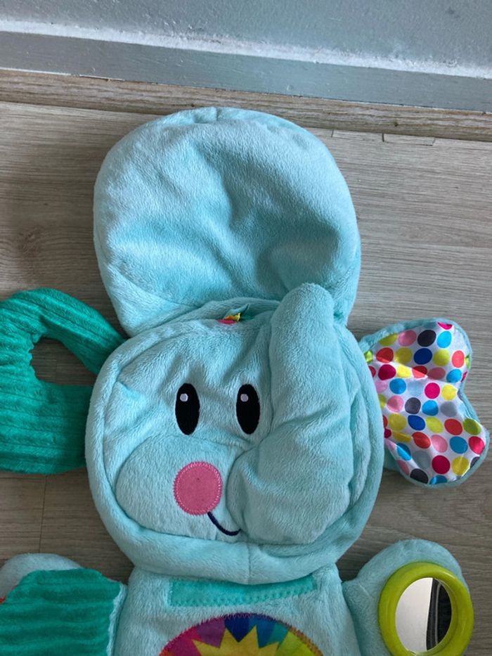 Éléphant d’activité comprenant de nombreux hochet, un miroir, un coin coin pour que le bébé s’amuse hauteur de l’éléphant 50 cm Refermable par bande velcro sur le cotée