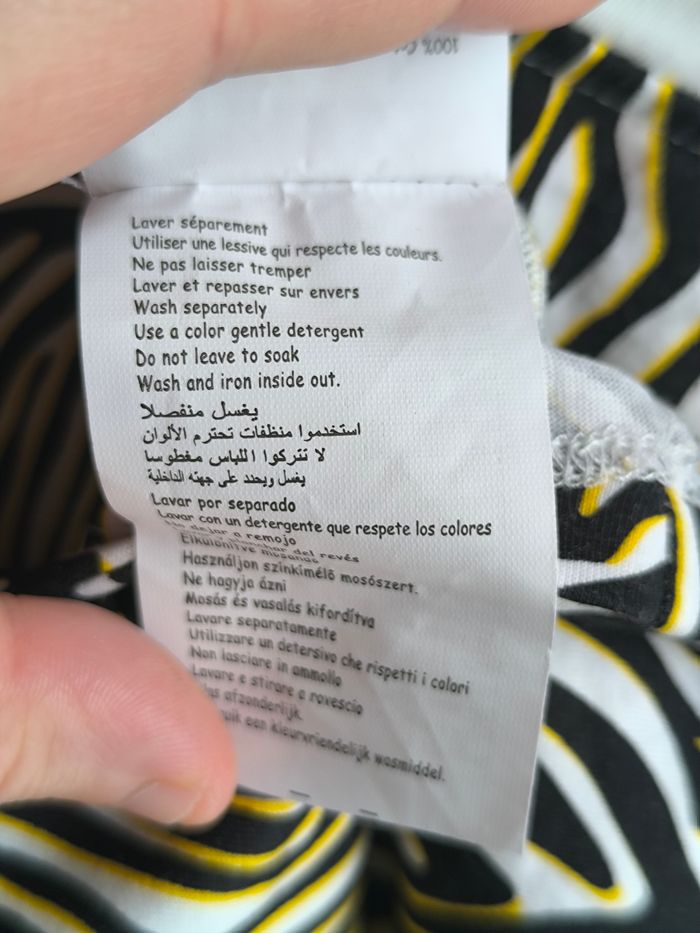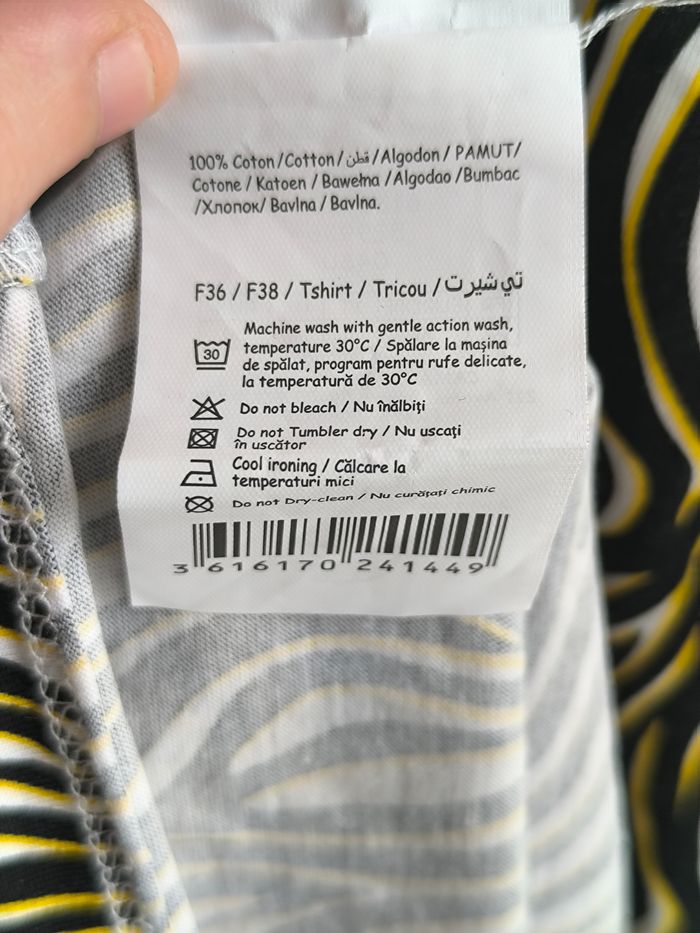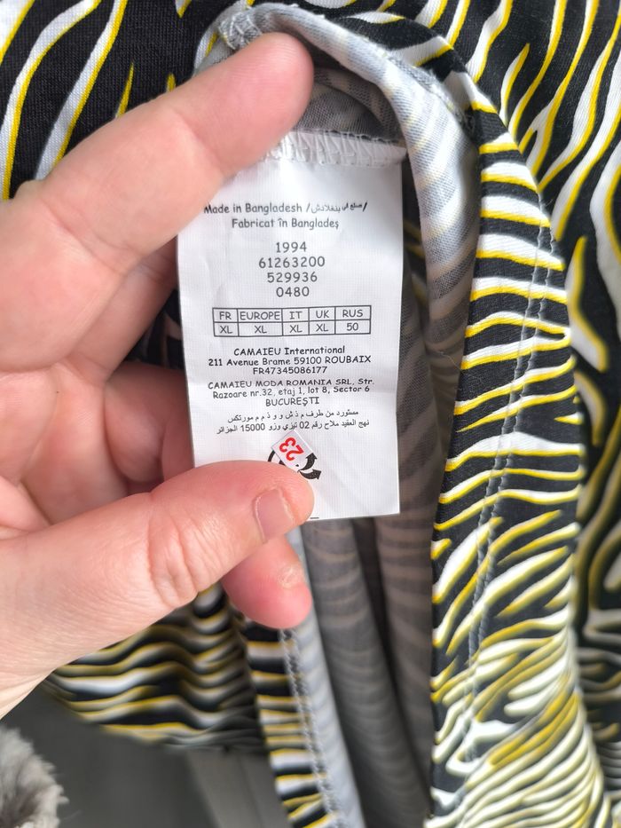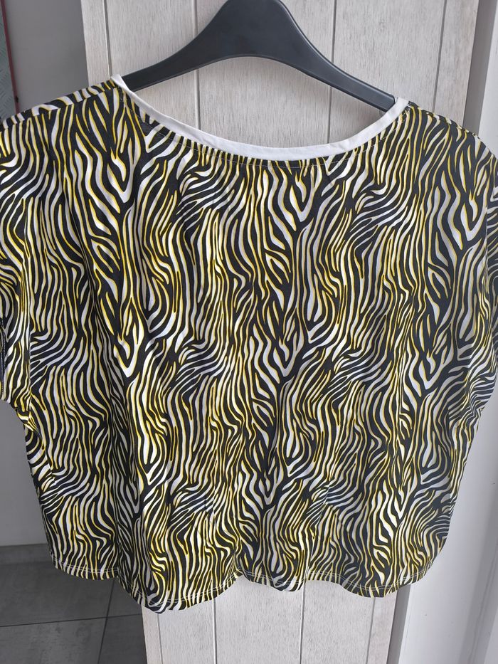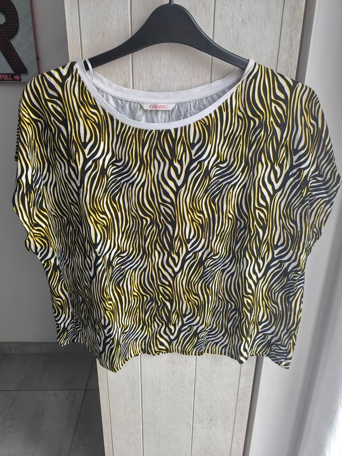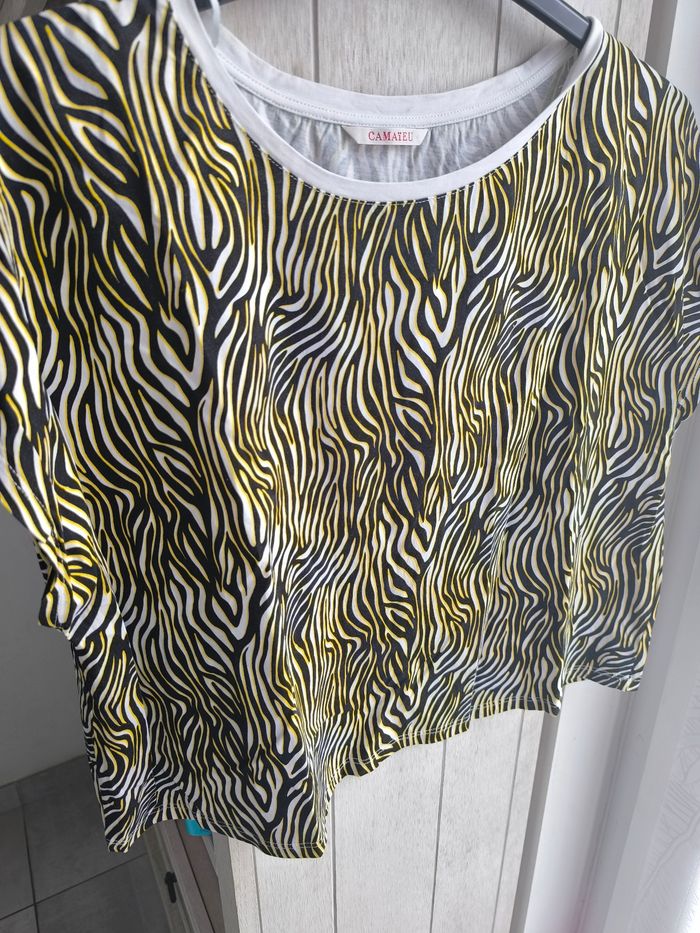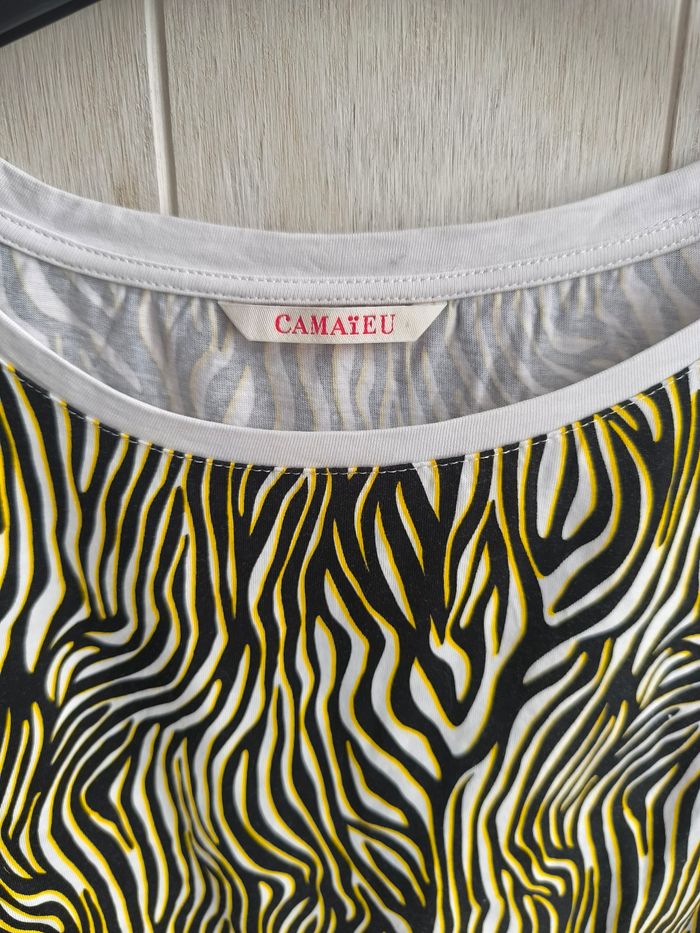 Marque: Camaïeu Taille:XL mensurations en photo pas de photos portées je ne rentre pas dedans Couleur:Jaune, blanc et noir Matière:Coton Etat: Très bon état jamais porté