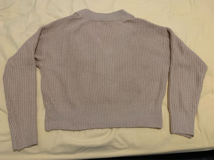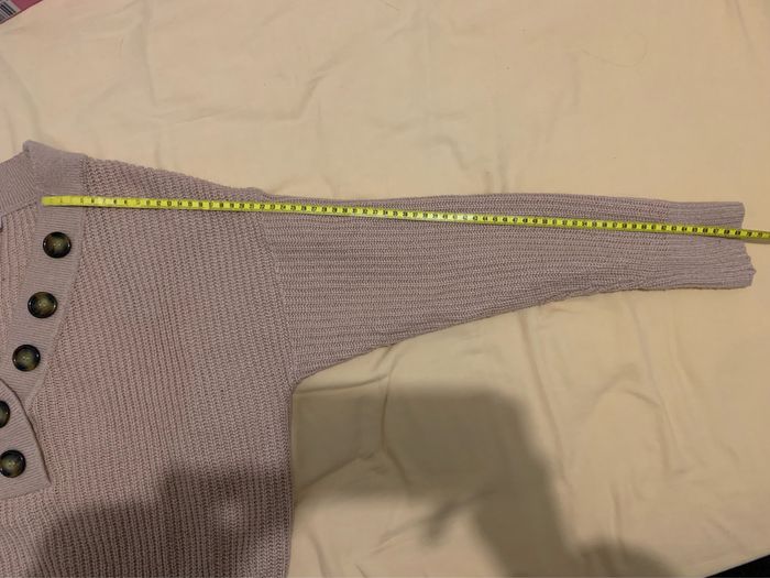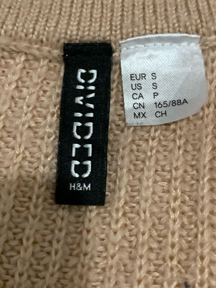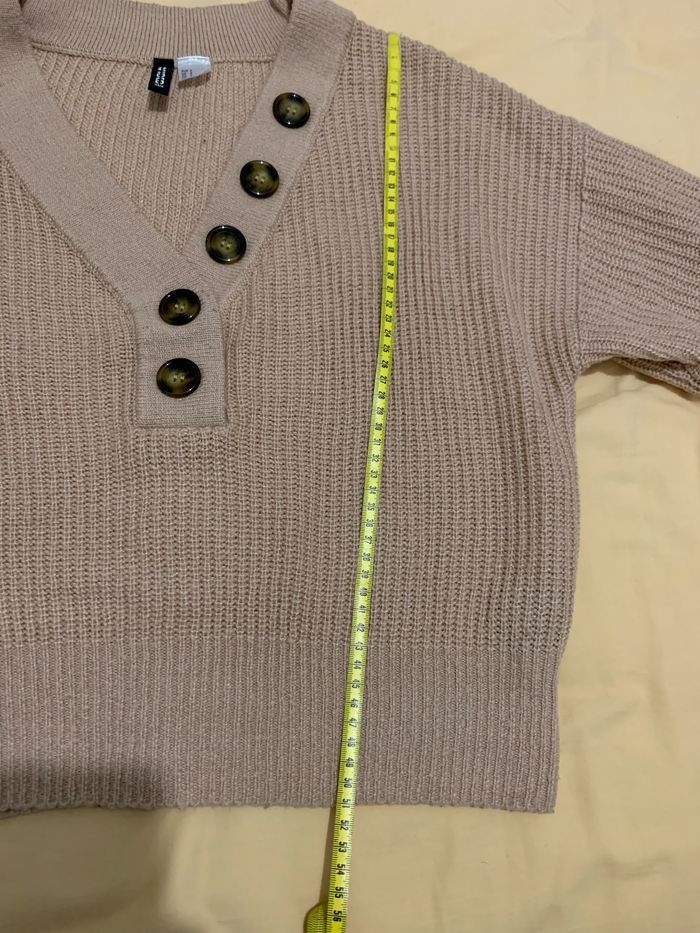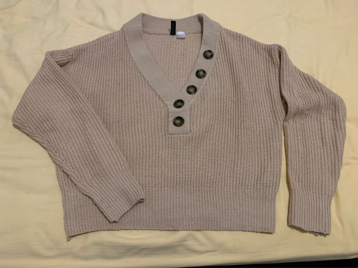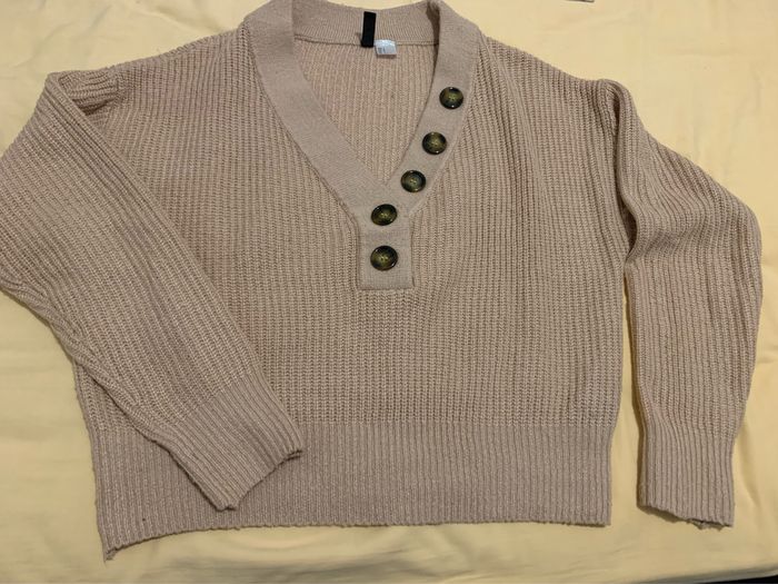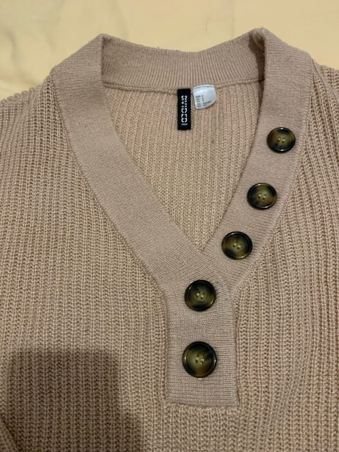 Pull femme avec un grand col V décoré de 5 boutons, pull couleur beige foncé, taille S de chez H&M