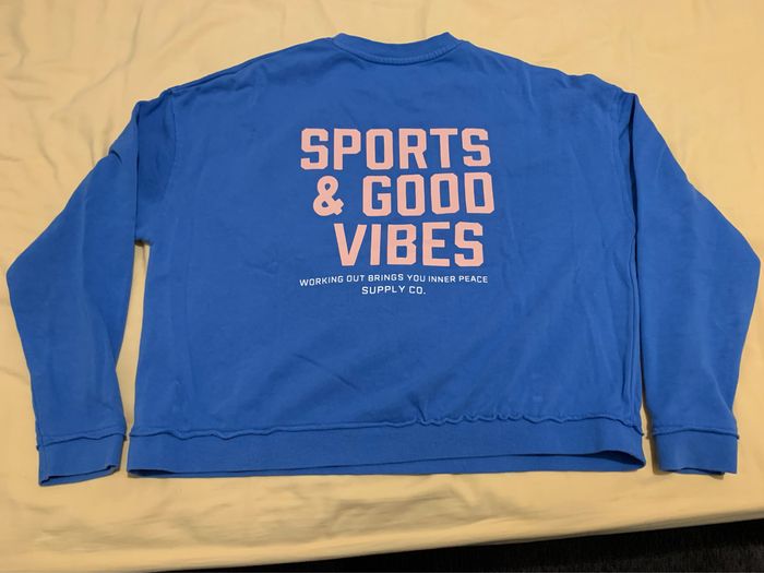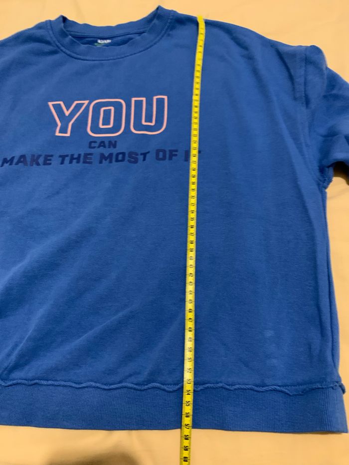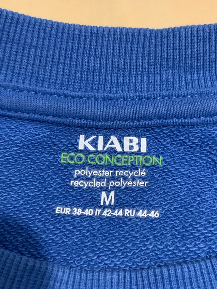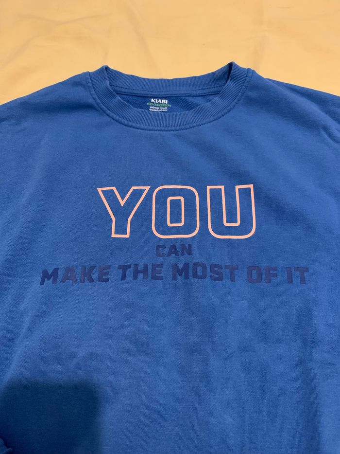 Sweat bleu avec inscription devant et dans le dos, taille M de chez Kiabi