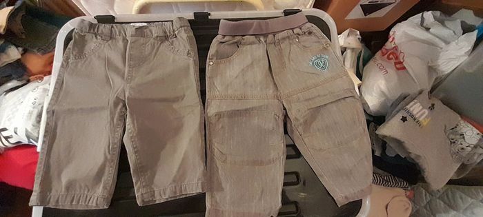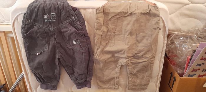 Lot de 2 pantalons et 2 salopettes en très bon état. Plusieurs marques. 1 euro pièce 9 mois