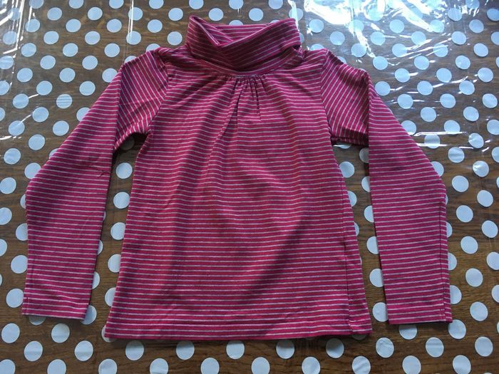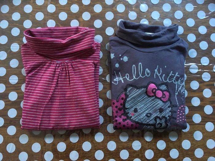 Lot de 2 sous-pull notés 8 ans qui taillent plutôt 6 à 7 ans ~ Vendus 4€50 ~ Sous-pull rayé Kiabi (NKY) 91% Coton / 5% Viscose / 4% Elasthanne ~ Sous-pull Hello Kitty avec « strass » en relief (Coton + Elasthanne)