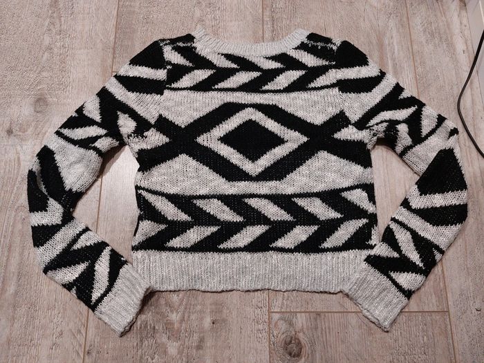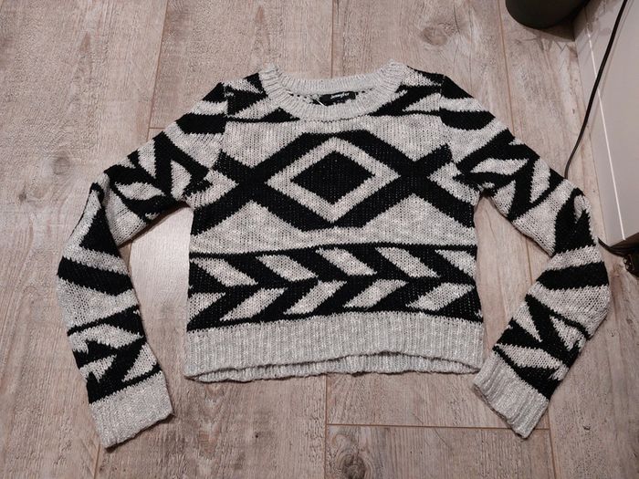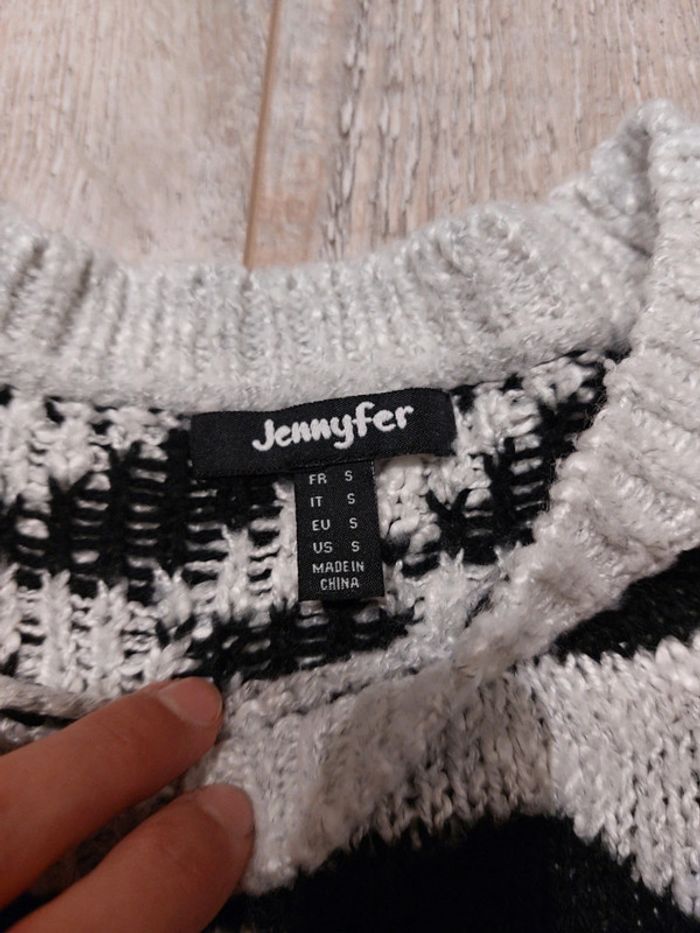 Coupe idéal pour mettre avec un jean taille haute Pull en maille court (arrive au niveau du bas du ventre), blanc et à motifs noir, de la marque Jennyfer. Taille S. Coupe idéal pour mettre avec un jean taille haute (Mom, Flare, High Waist etc...) En bon état (quelques bouloches légères)