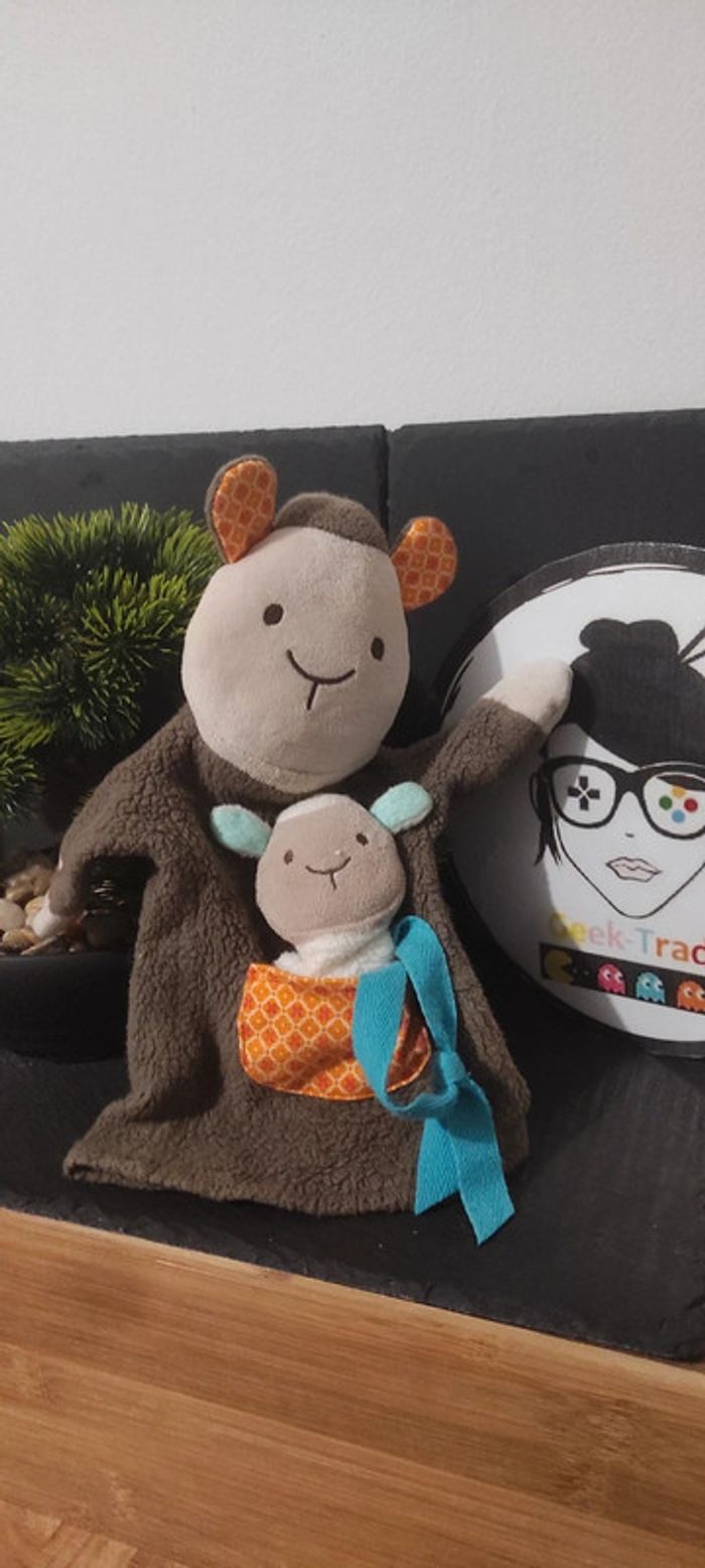 doudou marionnette mouton nature et Découvertes agneau marron poche fleur orange vert bleu