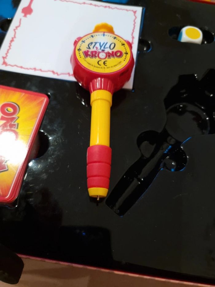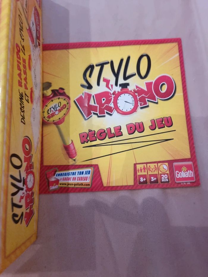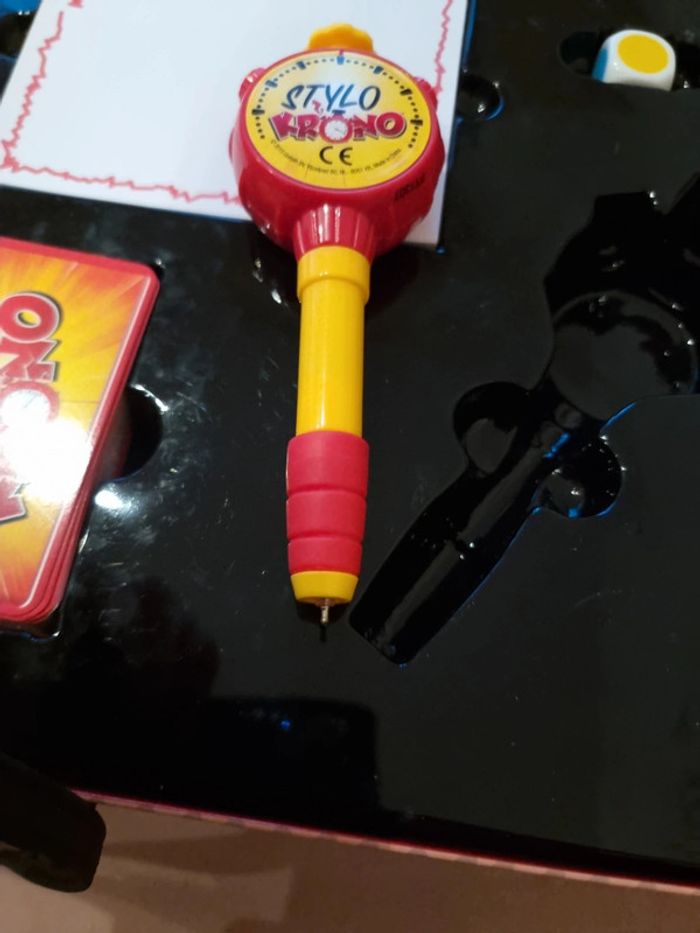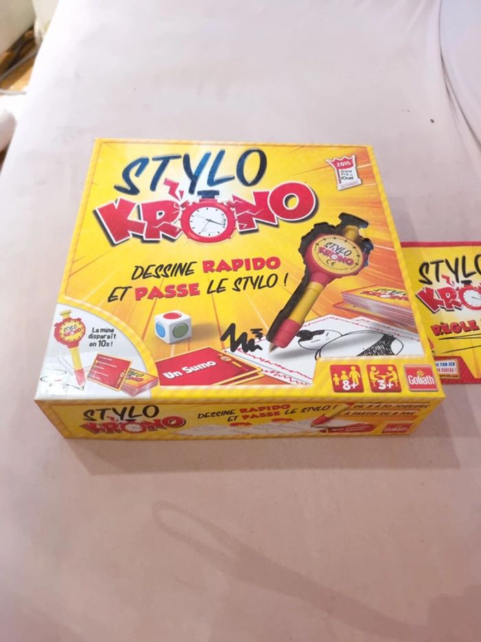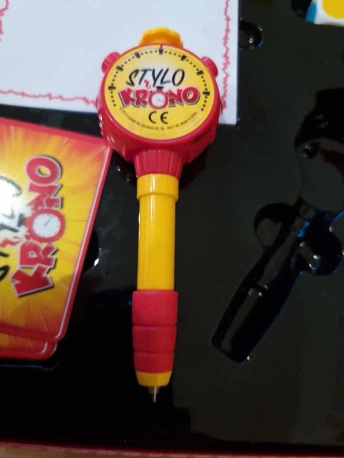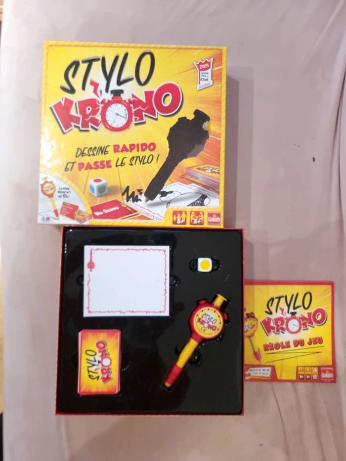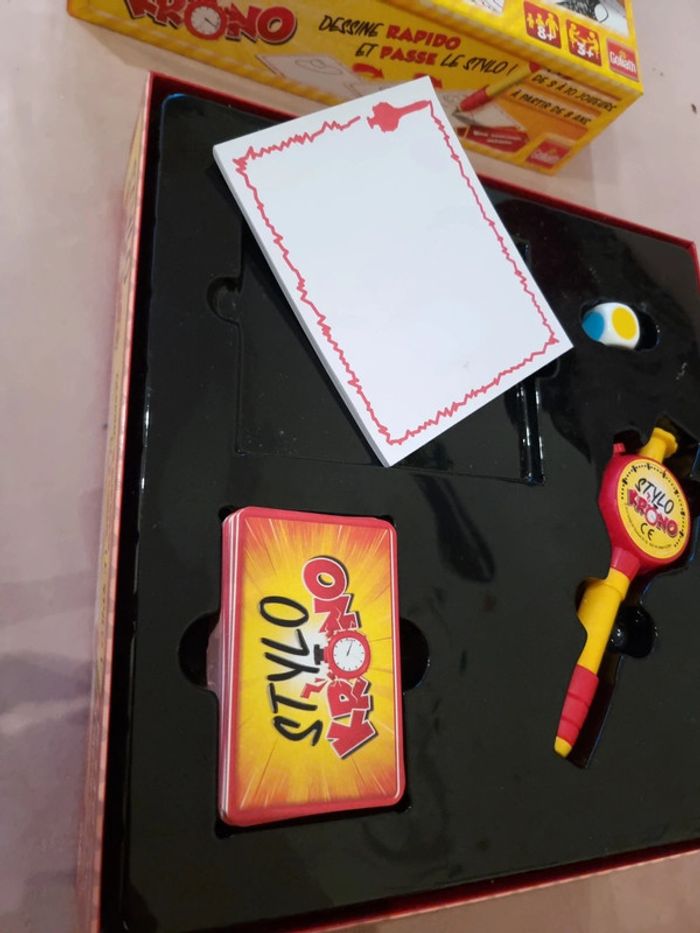 Stylo Krono COMPLET Jeu état neuf, car servi une seule fois STYLO KRONO - DEFIS DESSIN EXPRESS : Le compte à rebours commence : 3…2…1… Top, c'est parti ! Défie-toi en dessinant à la vitesse de la minuteur Stylo Krono, et essaie de terminer ton chef-d'œuvre avant que le temps ne s'épuise ! DESSINE VITE, GAGNE POINTS : Avec seulement 10 secondes, chaque joueur doit exprimer son talent artistique avant que le Stylo Krono ne disparaisse. Si le dessin n'est pas terminé, c'est au suivant de prendre le relais. Saurez-vous faire deviner le mot correspondant pour gagner des points ? JEU D'AMBIANCE DYNAMIQUE : Stylo Krono est l'ultime défi pour les dessinateurs éclairs et les amateurs de défis artistiques ! Un jeu d'ambiance dynamique, drôle et captivant, parfait pour des moments ludiques en famille ou entre amis lors de vos soirées. POUR TOUTE LA FAMILLE : Convient aux joueurs à partir de 8 ans, Stylo Krono offre des moments de rire et de compétition saine pour toute la famille. Amusez-vous à deviner et à dessiner dans ce jeu palpitant qui mettra vos compétences artistiques à l'épreuve. CONTENU : Le jeu comprend 1 minuteur Stylo Krono, 1 stylo à bille, 1 dé, 104 cartes avec des mots à deviner, et 1 carnet à dessin. Tout ce qu'il faut pour des heures de divertissement créatif #angel_enfant_jeu_jeudesociété