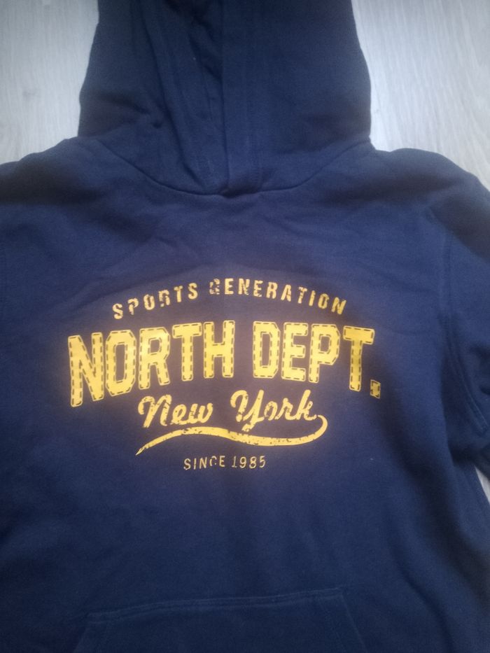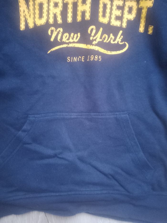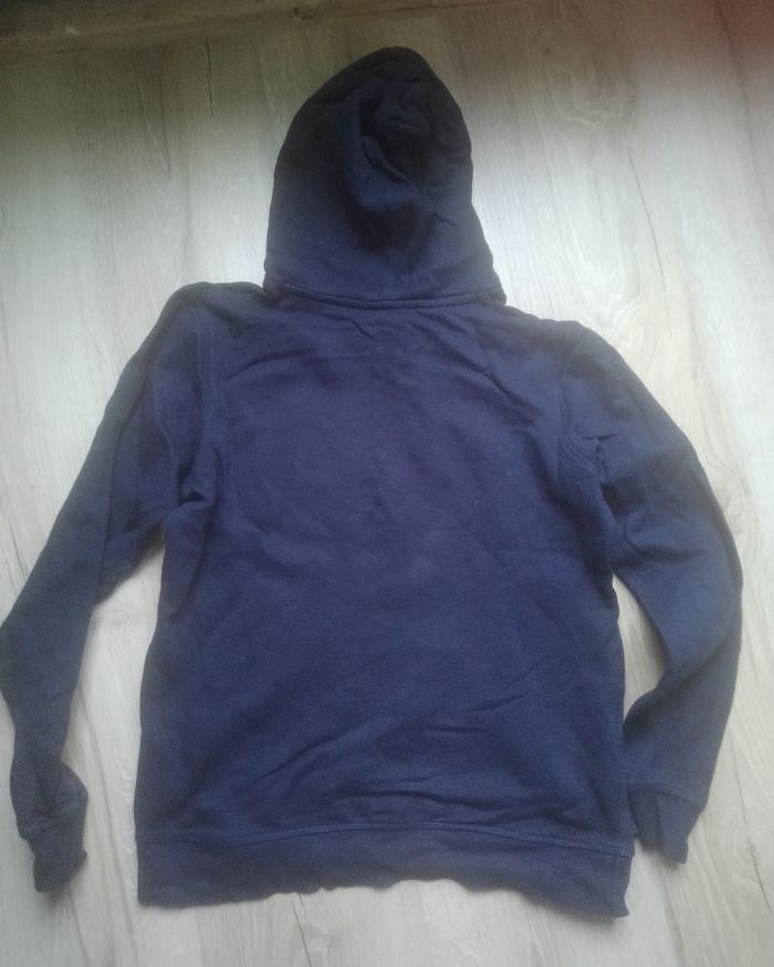 Couleur bleu marine avec inscription écrite devant. Poche ventrale. Taille 12 ans (150 cm). 80% coton, 20% polyester. Très bon état.