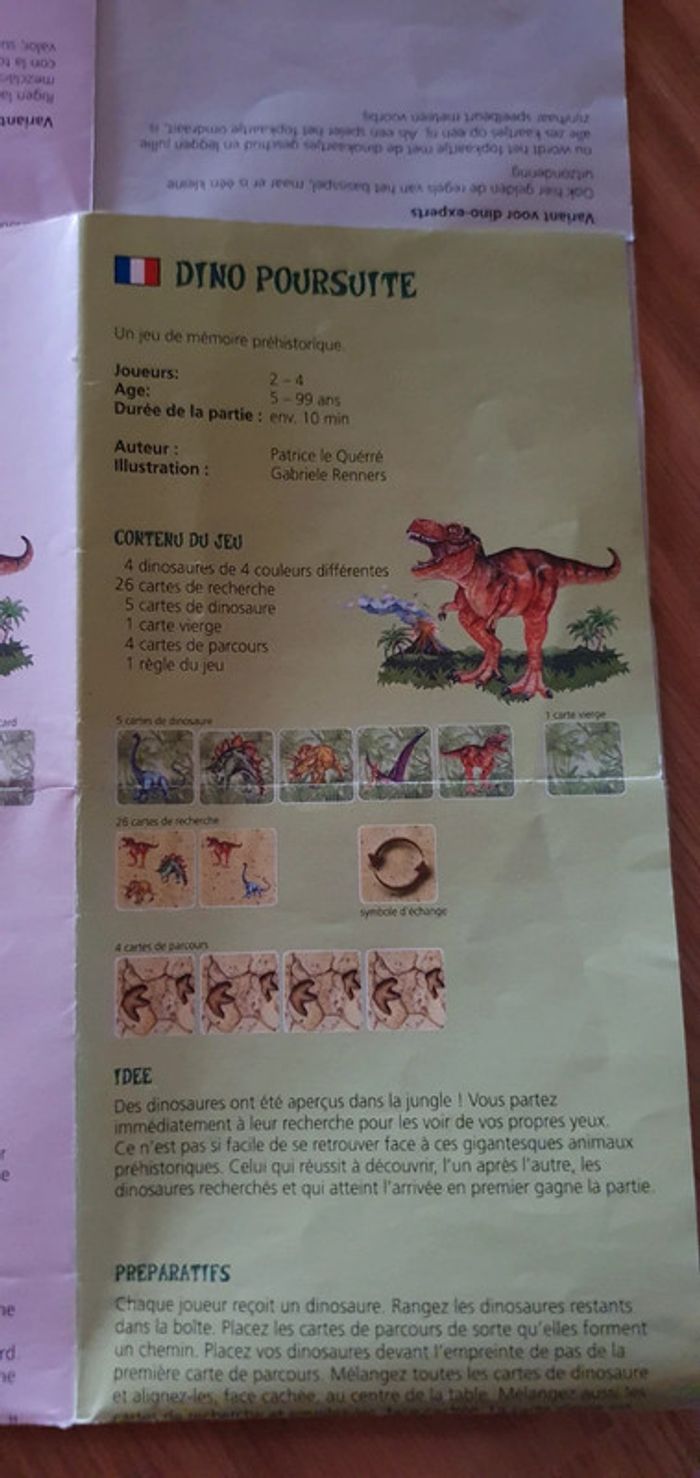 Dino poursuite est un jeu de mémoire et de parcours. Pour avancer sur la piste, vous devez dévoiler toutes les cartes dinosaure correspondant à la carte de recherche retournée. Comme ce serait trop facile, certaines des cartes de recherche imposent d'intervertir deux cartes dinosaures. Un jeu interdit aux distraits ! complet 4 dinosaures 26 cartes de recherche 5 cartes de dinosaures 1 carte vierge. 4 cartes de parcours 1 règle du jeu