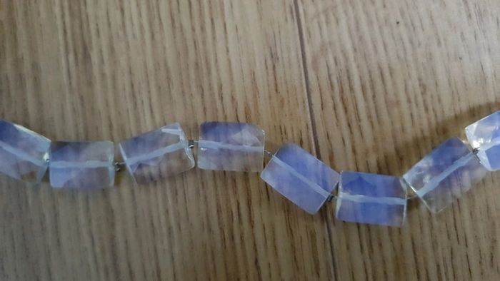 collier sympa brillant nacre mauve constitué d un câble et d accessoires en verre. je ne sais pas quel matière est ce si c est du verre ou du plastique tres dur mais il y a du poids.