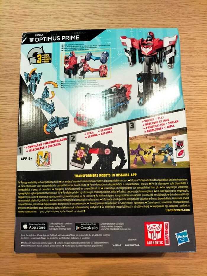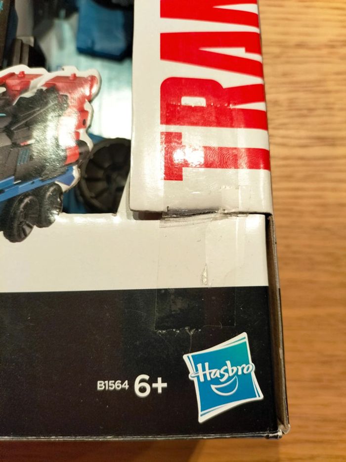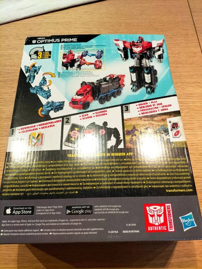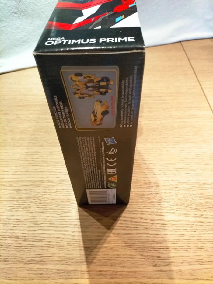 Mega Optimus Prime, de la série transformers, modèle B1564, marque Hasbro, à partir de 6 ans, transformable en trois étapes, modèle qui fait au moins 30 cm et sur lequel on peut ajouter des minicons (sorte de toupies) à clipser vendues séparément. Dans sa boîte d'origine, en très bon état, jouet en très bon état avec quelques légères traces d'utilisation.