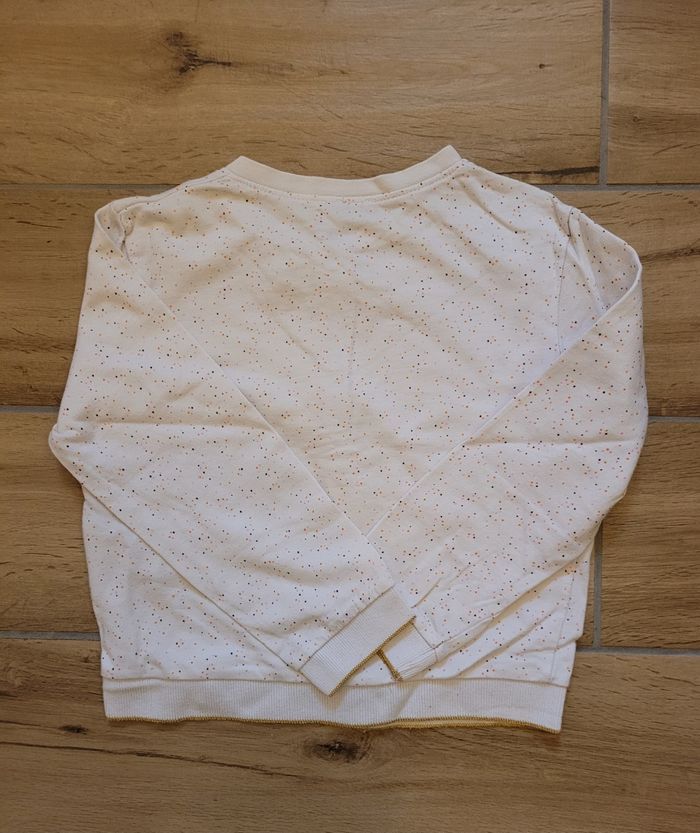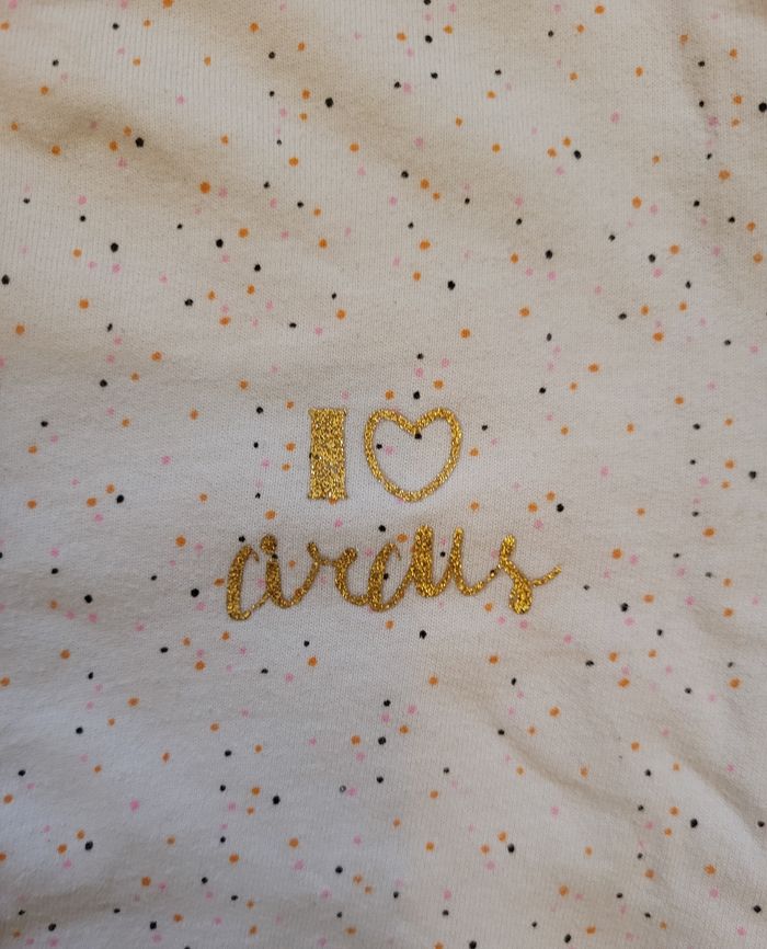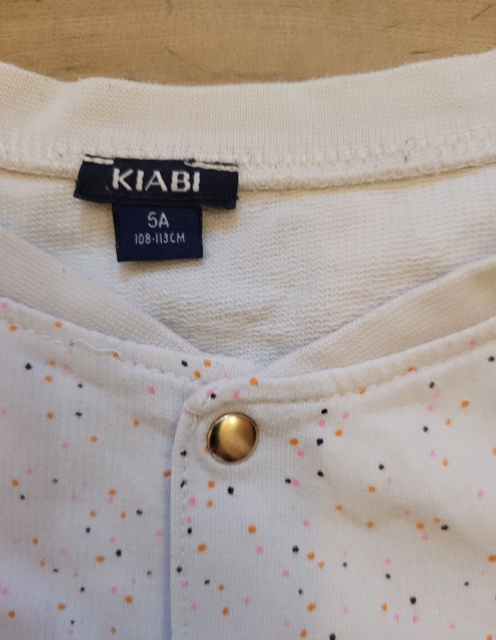 Gilet blanc avec des petits pois colorés, boutons pressions dorés et petit motif doré sur le devant.
