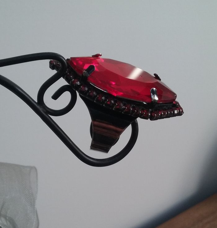 Bague ajustable, pierre rouge, longueur 4 cm. L'anneau a perdu de sa couleur noire (cf dernière photo).