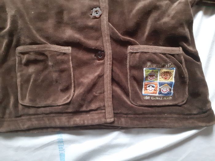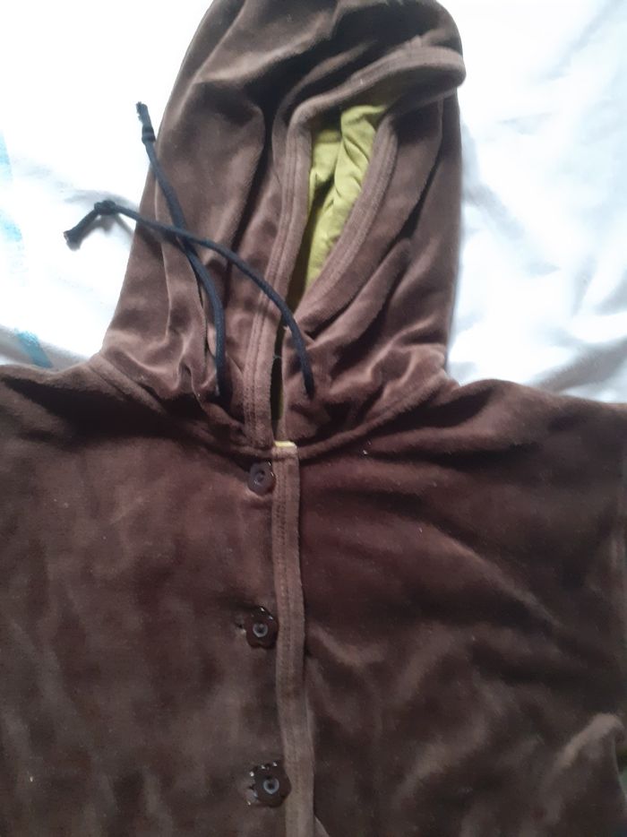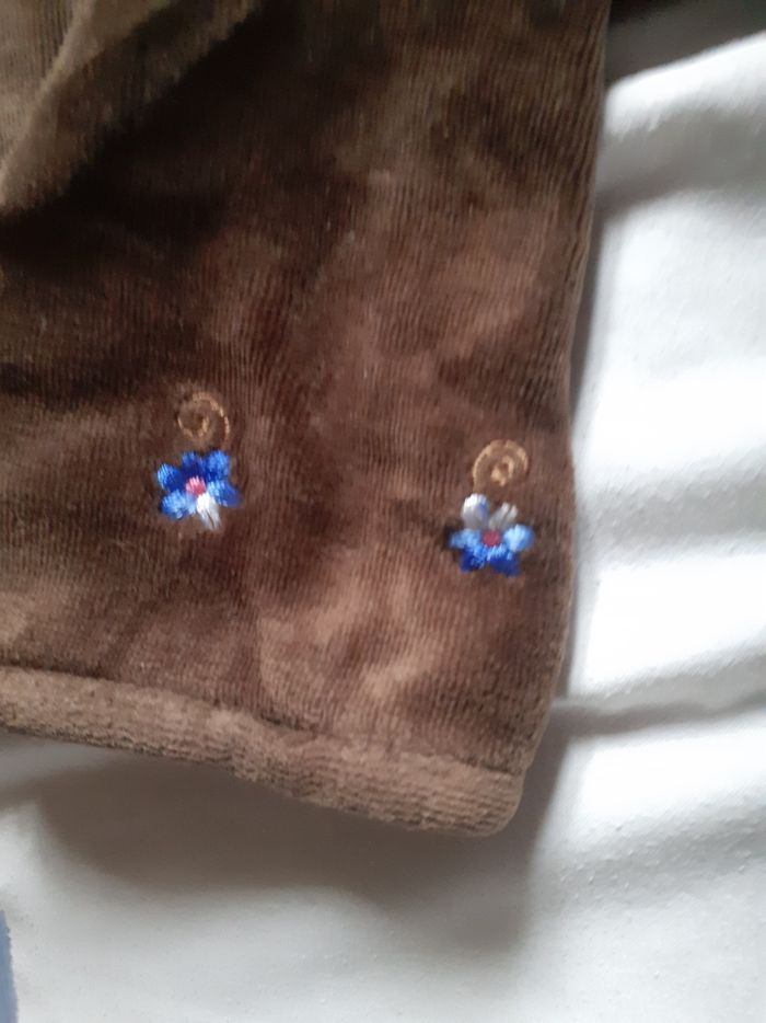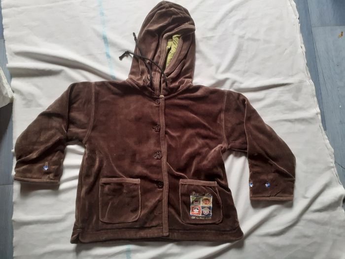 Veste épaisse marron à capuche avec 2 poches et motif de 2 petites fleurs bleues 5 ans (manque 1 bouton fleurs en bas)