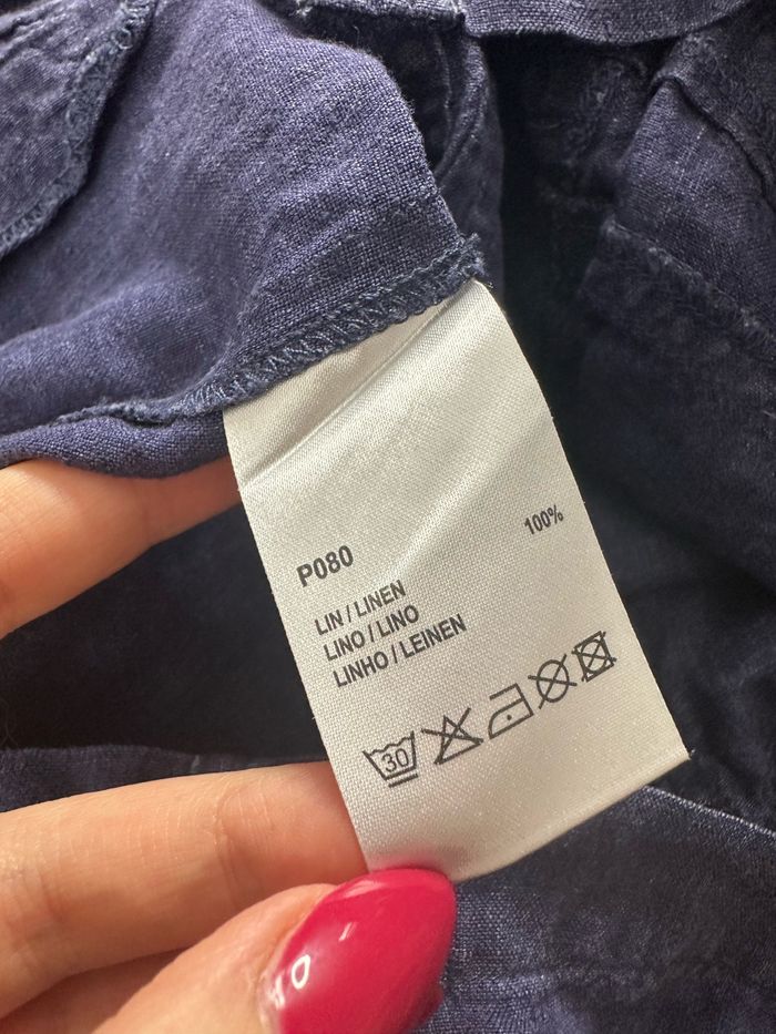 Blouse saharienne - Excellent état - Taille 44 équivalent XXL - Marque Gérard Darel - Couleur bleue marine - Se ferme avec des boutons - Lien à la taille - 100% lin Dimensions: - 40cm niveau épaules - 55cm niveau aisselles - 65cm de long