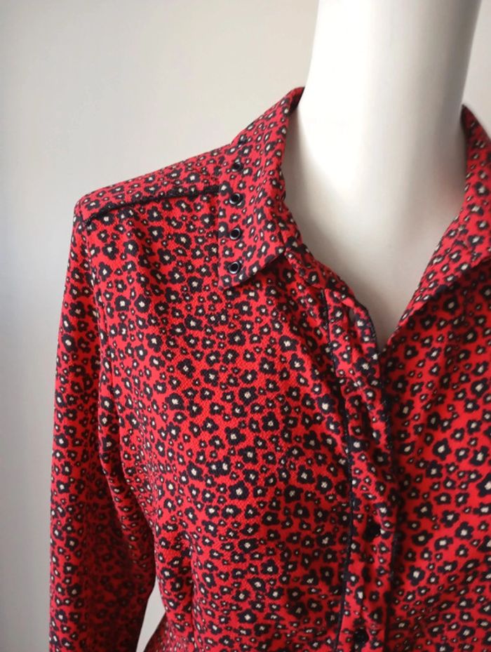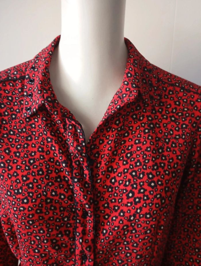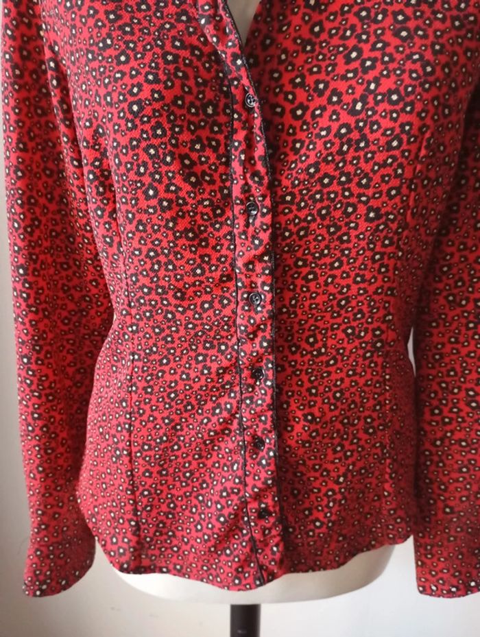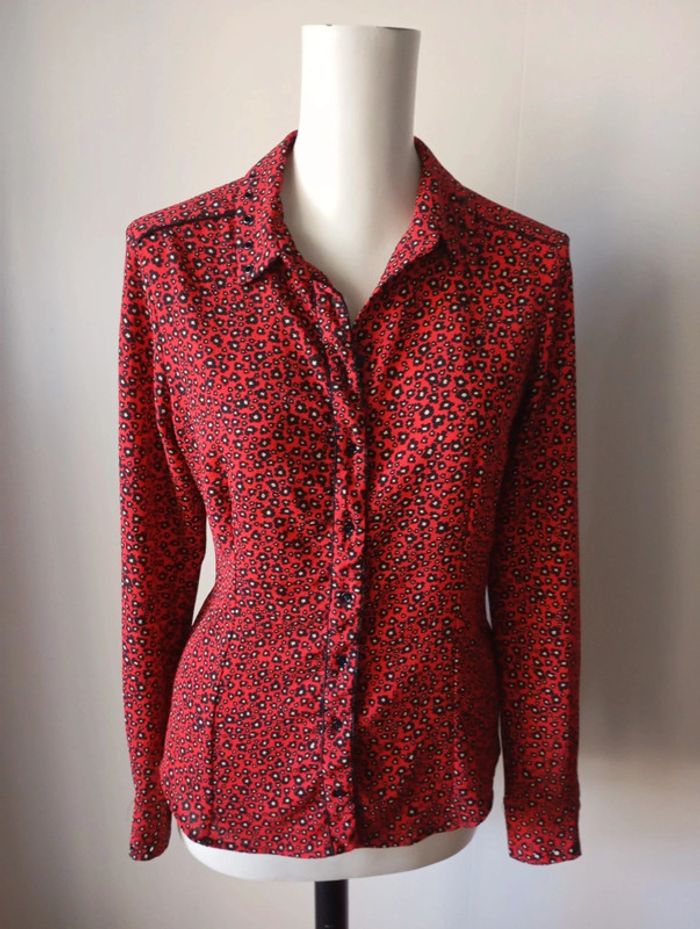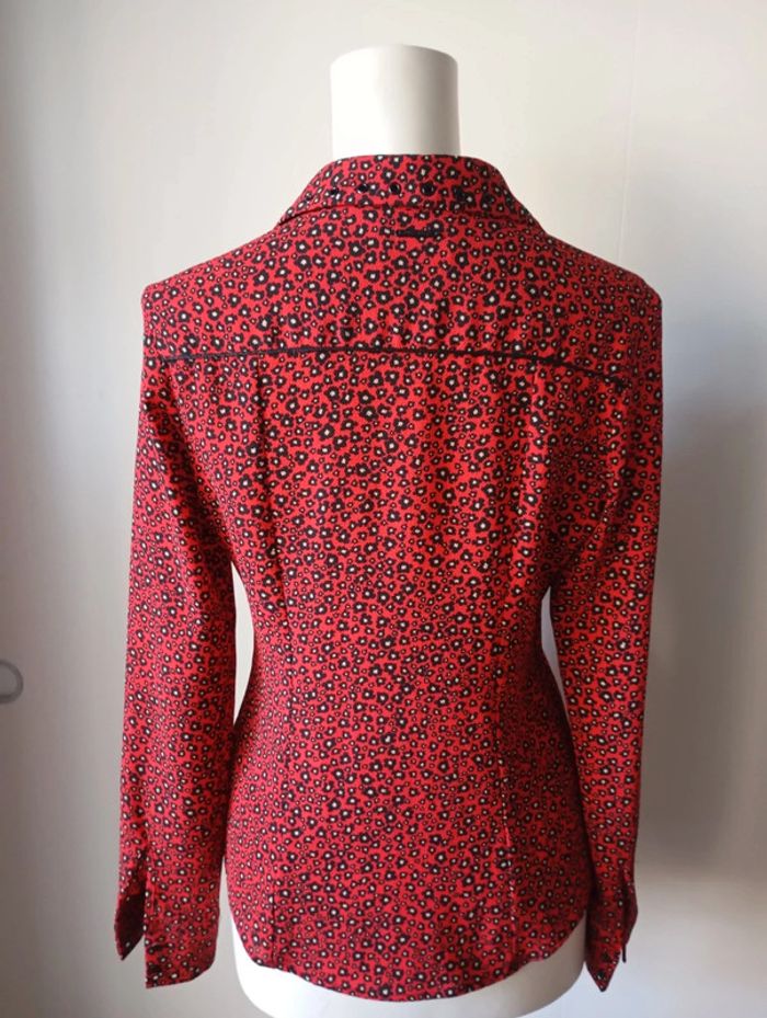 Chemise cintrée femme, taille 38, de couleur rouge noire et blanche Longueur 63 cm Épaule. 40 cm Poitrine. 49 cm Composition 94% polyester 6% elasthane