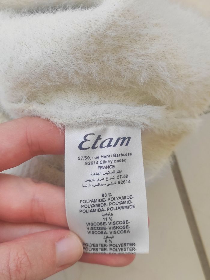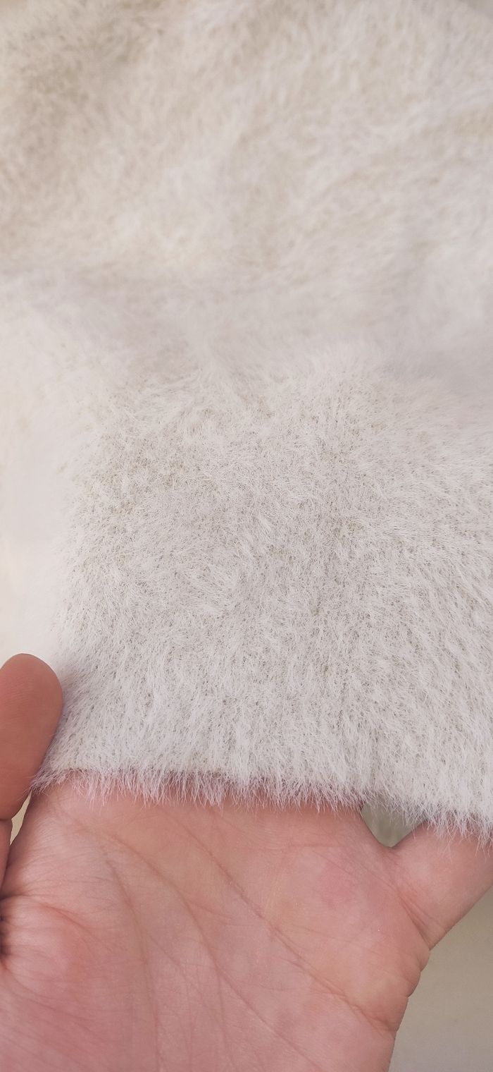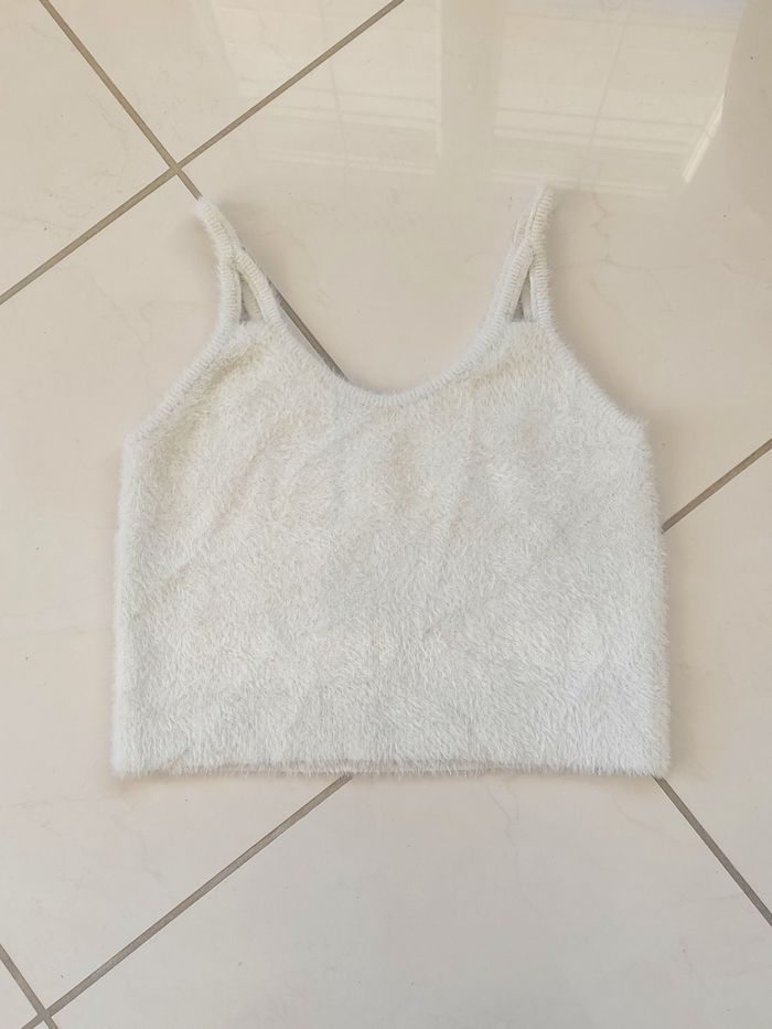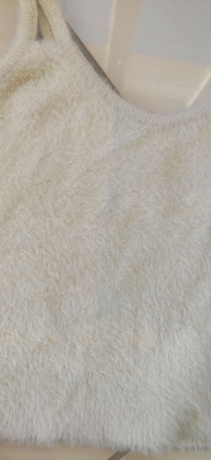 Crop top blanc écru duvet, effet très doux/pilou pilou. Petite trace bleue très peu visible (photo). D'où le petit prix.