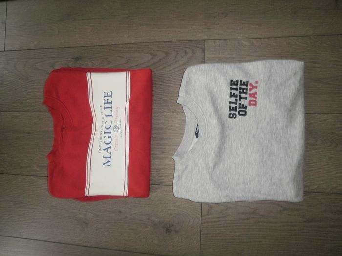 Bonjour, Je vends ce lot de 2 sweat-shirts pour Fille/Jeune Fille en taille XS ou 14 ans et de marque Kiabi. Le sweat-shirt gris est léger. Coloris : Rouge et Gris avec motifs. Aticles NEUFS, jamais portés par ma fille, juste lavés par mes soins. Prix demandé : 6€ le lot.
