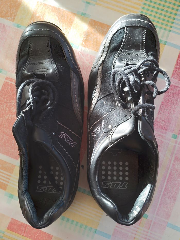 Magnifique paire de chausures basket noir en cuir premiere.pour homme. Neuf jamais mis. Taille 43.marque tbs. C'est ideale, a la proche des fêtes pour un cadeau. Pour vous faire economiser sur la livraison je met le poids en-dessous. Envoie rapide et bien emballer.