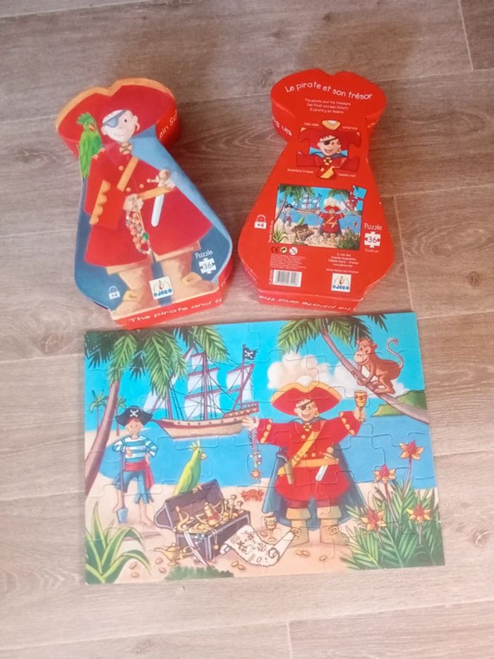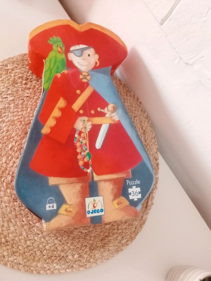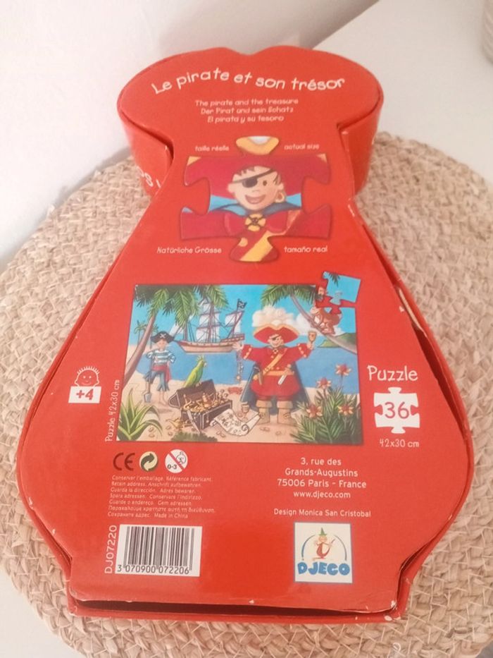Puzzle DJECO Le pirate et son trésor 36 pièces 4 ans et plus Dimensions du puzzle 42x30 cm Complet Jolie boîte decorative Très bon état (voir photos) la boîte présente quelques défauts, rien de méchant D'autres modèles de la même collection dans mon dressing