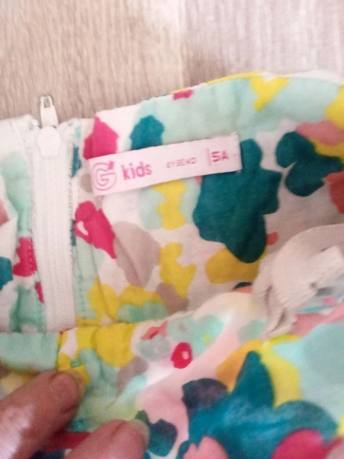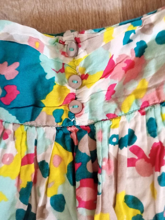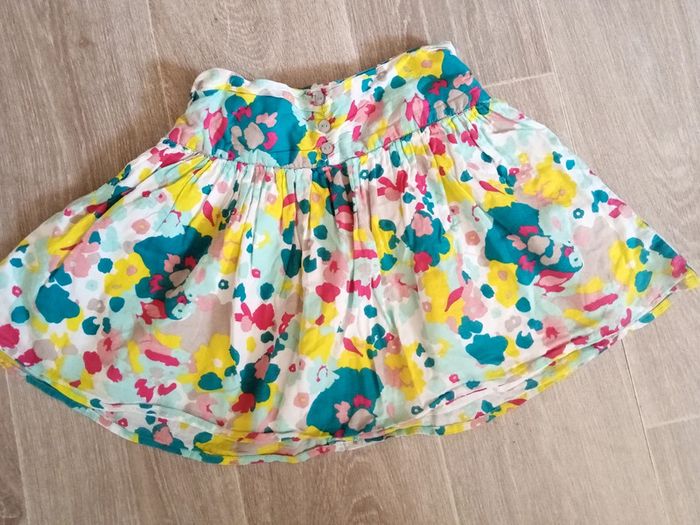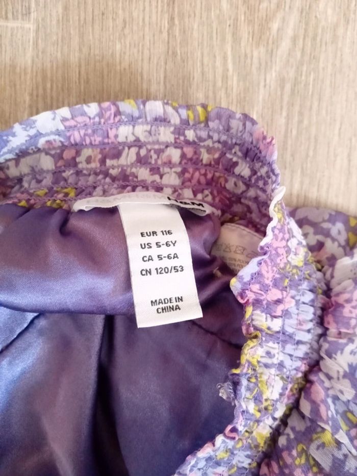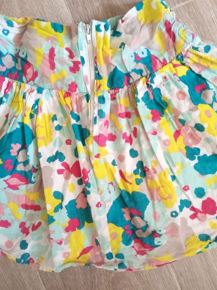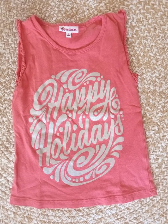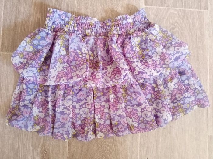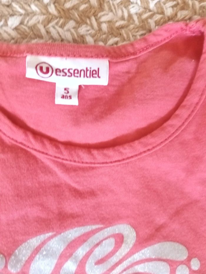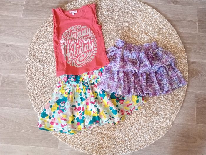Petit lot fille été - 1 jupe légère H&M - 5/6 ans- violette à fleurs - volants - comme neuve - 1 jupe à fleurs - fermeture éclair au dos - 5 ans - Gémo - très bon état - 1 T.shirt manches courtes corail - motif pailleté sur le devant - 5 ans - U Essentiel - Très bon état