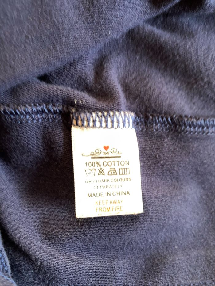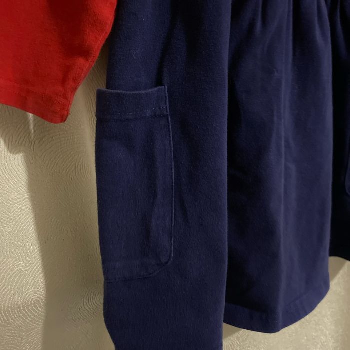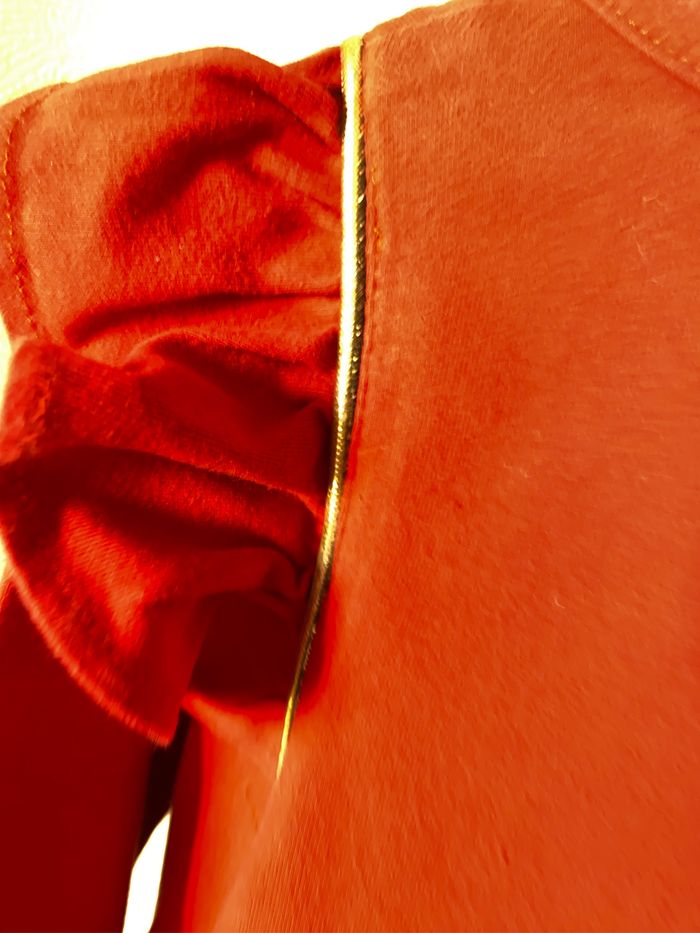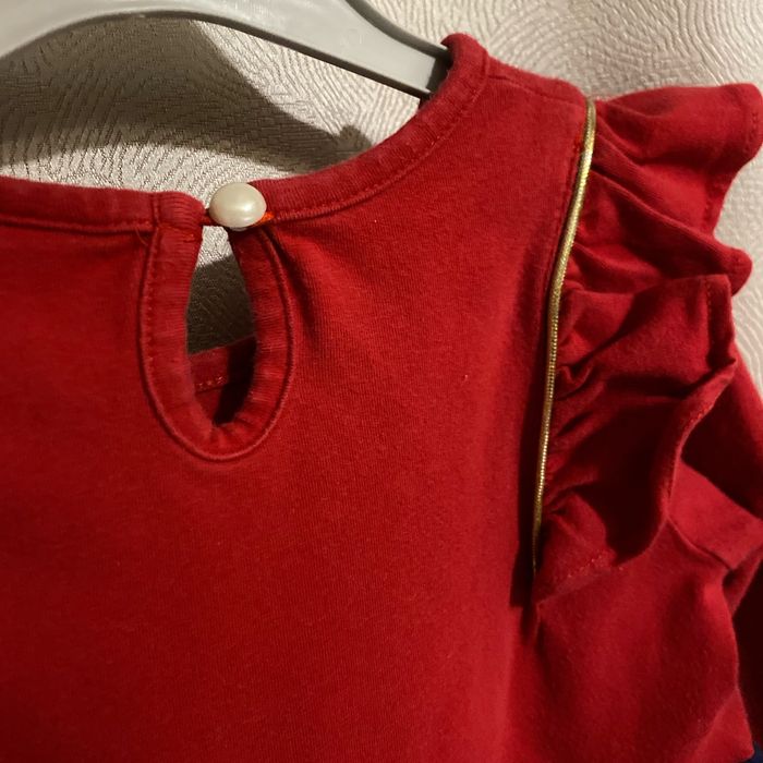 Très jolie robe confortable manches longues 100% coton Corsage rouge volant aux emmanchures bordé d’un biais doré , gros coeur sequins dorés Ceinture élastique dorée Jupe bleu marine avec 2 grandes poches latérales Taille 2-3 ans 98 cm ( plutôt 3 ans)