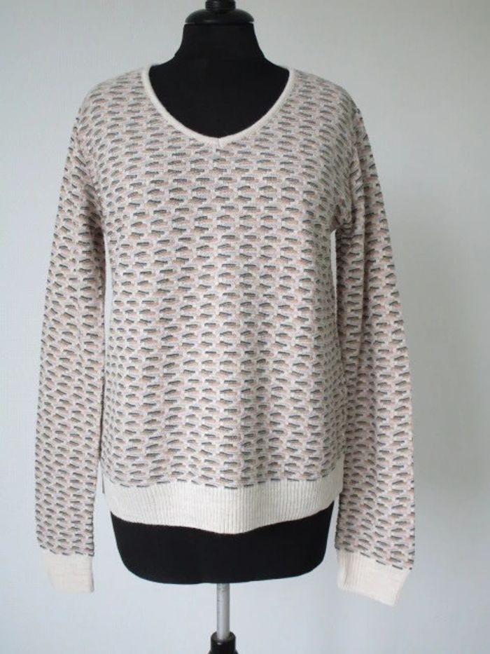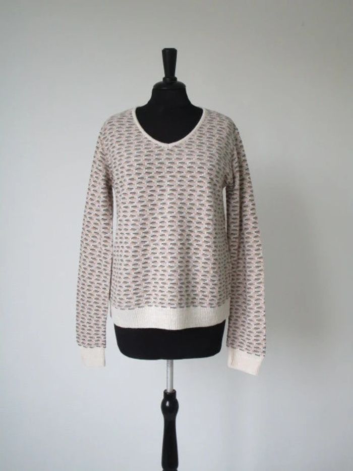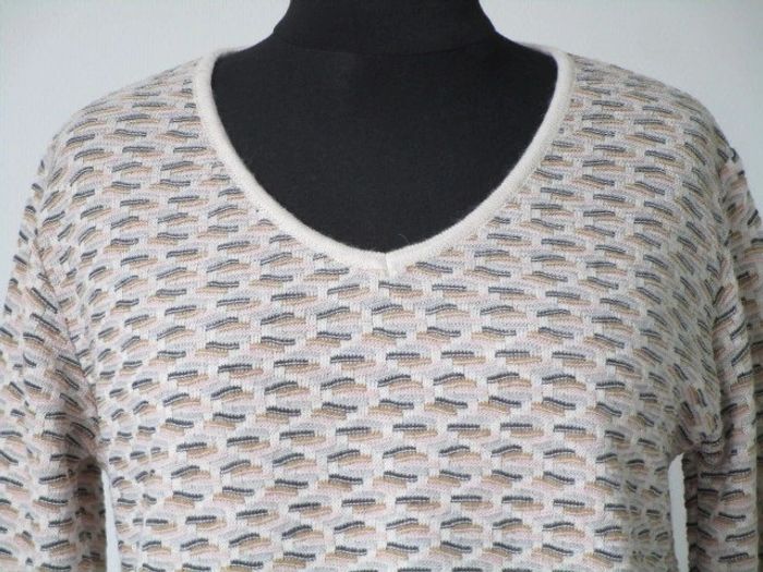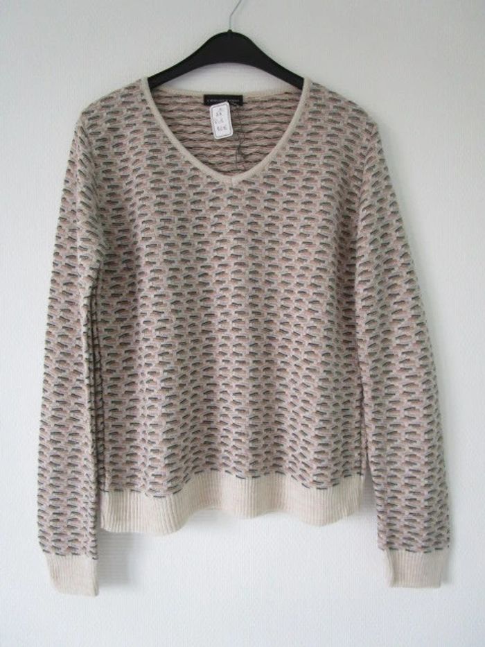 Pull de marque L'Atelier d'Anna Pas d'étiquette de taille, correspond à du 38/40 (cf mesures) Col V Fond crème Motifs beige/kaki/moutarde/rose pâle/vert amande 75% acrylique/10% viscose/10% laine/5% alpaga Fabriqué en Italie Largeur carrure : 41 cm Largeur aisselle à aisselle : 51 cm Longueur : 61 cm NEUF avec étiquette #mamanbrade59femme38 #mamanbrade59femme40