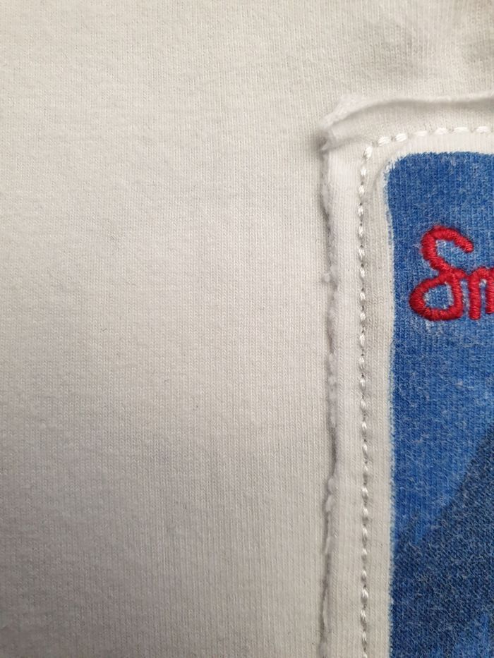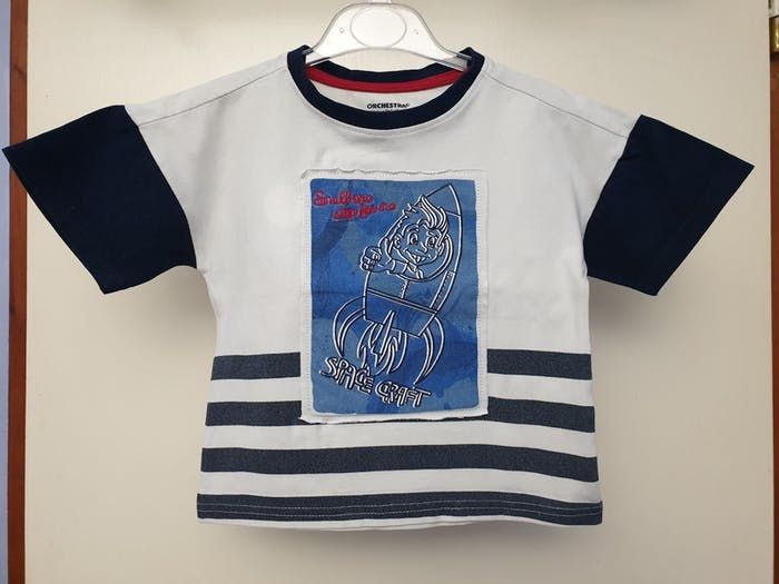 T-shirt manches courtes en jersey avec fusée printée Rond blanc visible à l'avant et à l'arrière du T-shirt laissé par un détachant Prix neuf: 11,99 euros