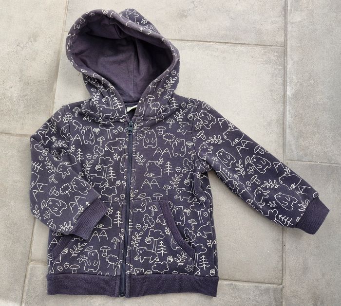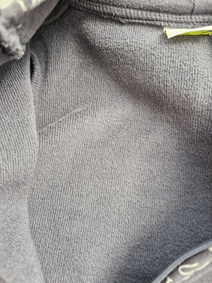 Motifs ours, arbres,... thème automnal. Portée mais en très bon état. Quelques bouloches au niveau des poignets (photo). Aucune tâche, aucun trou. 2 poches devant. Intérieur polaire chaud.