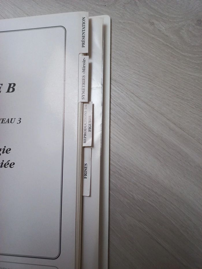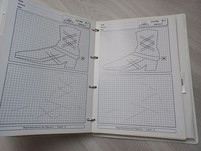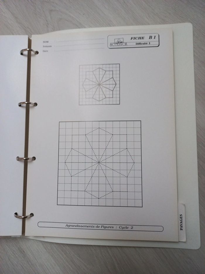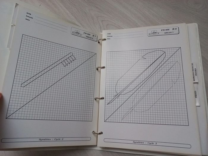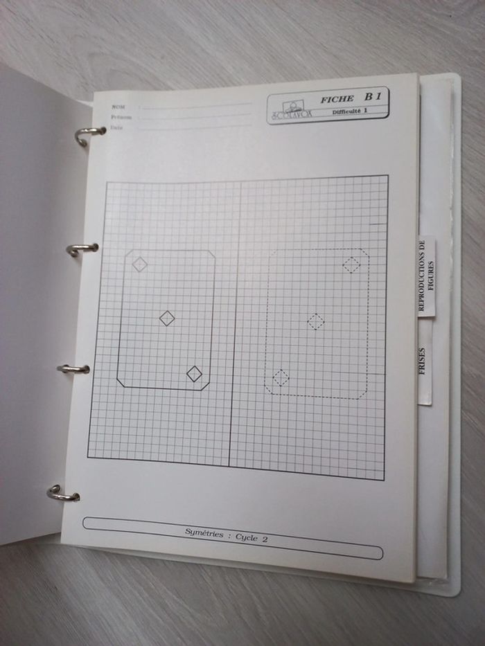 Pavages, symétrie, symétrie et reproduction de figures. Classeur incomplet mais manque peu de fiches