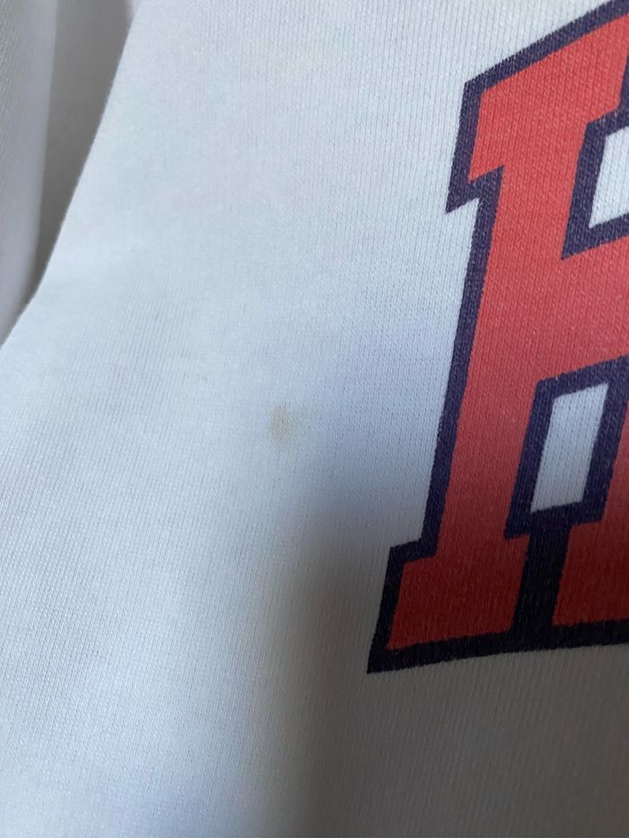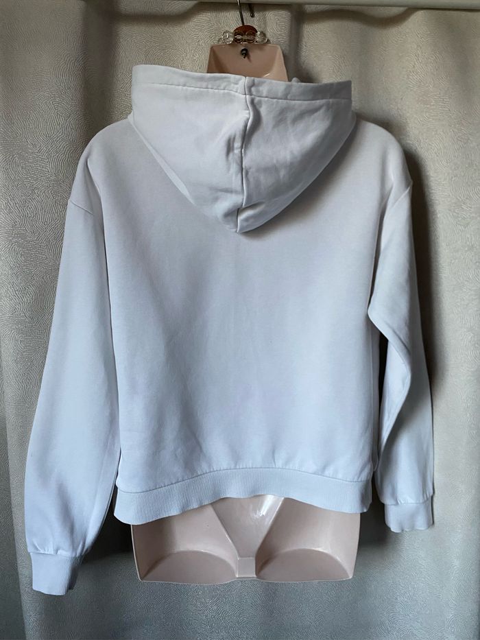Pull sweat à capuche blanc Écriture saumon et violet hopeful and joyful Taille XS ou 34 Coton molletonné Kiabi Bien blanc cependant une tâche à côté du H majuscule, quelques traces légères aussi sur les poignets Longueur 55,5 cm Carrure 51 cm Aisselle à aisselle 50 cm