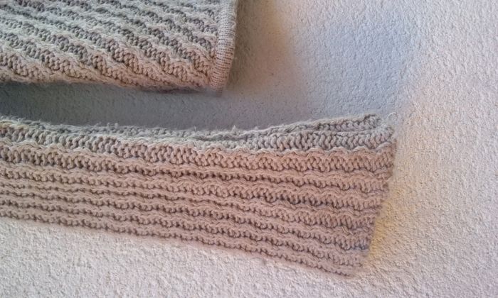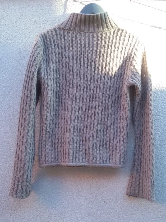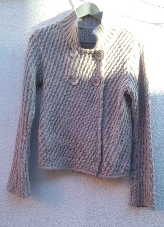 Il est joli et chaud donc pas mal porté, donc bouloché! J'ai commencé à enlever les bouloches au dos, qui est de ce fait nickel, mais il reste le devant et les manches à faire! Coloris marron clair.