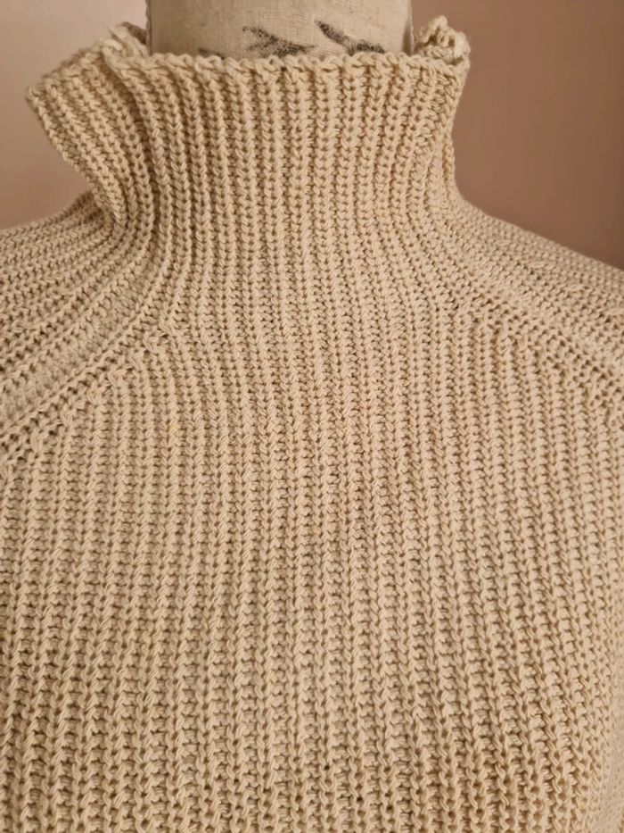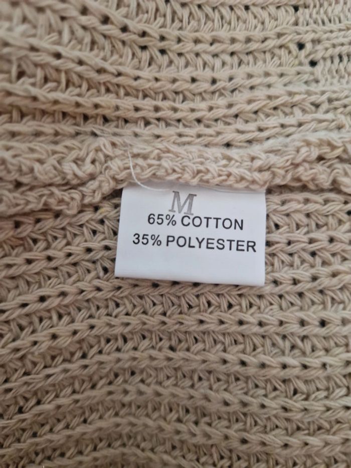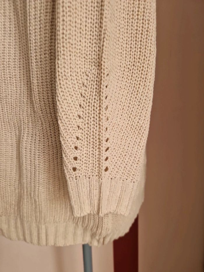 Robe pull couleur beige, en coton et polyester, col cheminée, manches longues, déco ajourée sur les manches, taille M, sans marque, neuf Jamais portée Longueur : 70 cm Mesure aisselles : 58 cm